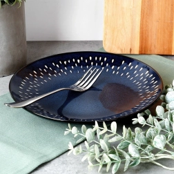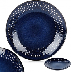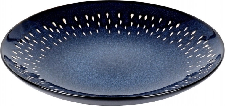 Diepe blauwe tint met decoratieve lichte stippen rondom de rand geeft de gedekte tafel een modern en elegant uiterlijk. Eenvoudig te combineren met ander servies.