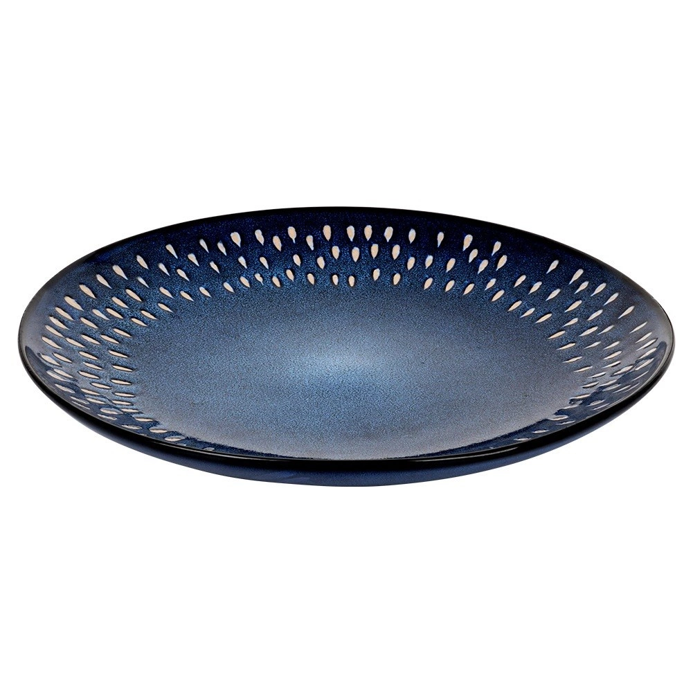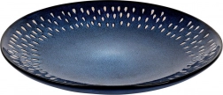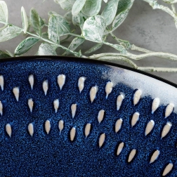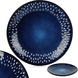 Dit stijlvolle ondiepe bord combineert een tijdloze ronde vorm met een opvallende glazuur in schakeringen van granaatblauw en subtiele witte accenten in traanvorm langs de rand. Het steengoed (gres) staat bekend om zijn hogere sterkte en slijtvastheid, waardoor het geschikt is voor dagelijks gebruik en intensieve inzet.