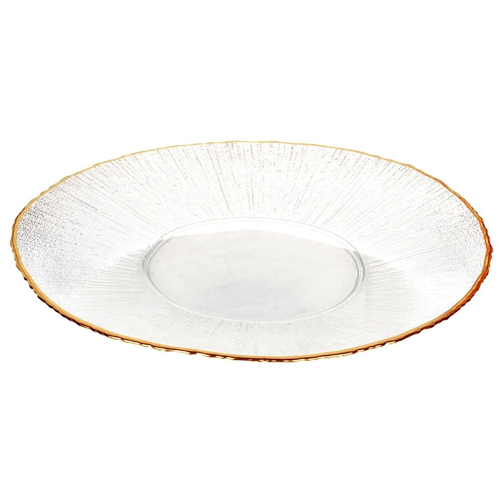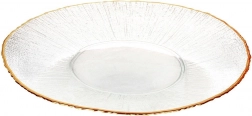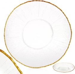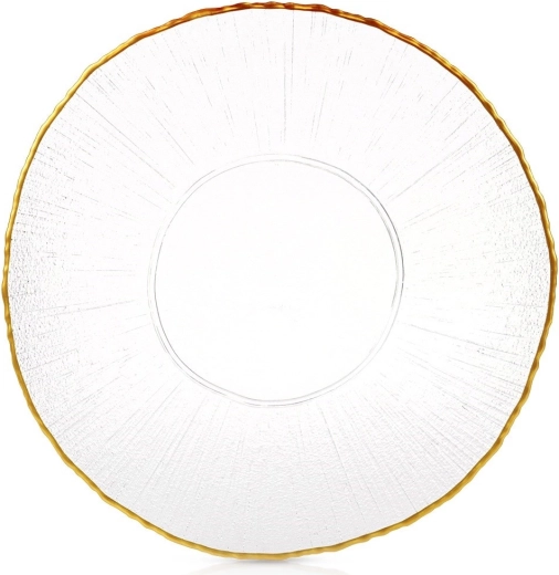 Dit veelzijdige glazen bord valt op door zijn zuivere look en decoratieve gouden bies, die elke tafel een vleugje luxe geeft. Het transparante glas met een fijne radiale reliëfstructuur accentueert de geserveerde gerechten en past zowel in een moderne als klassieke setting.