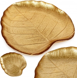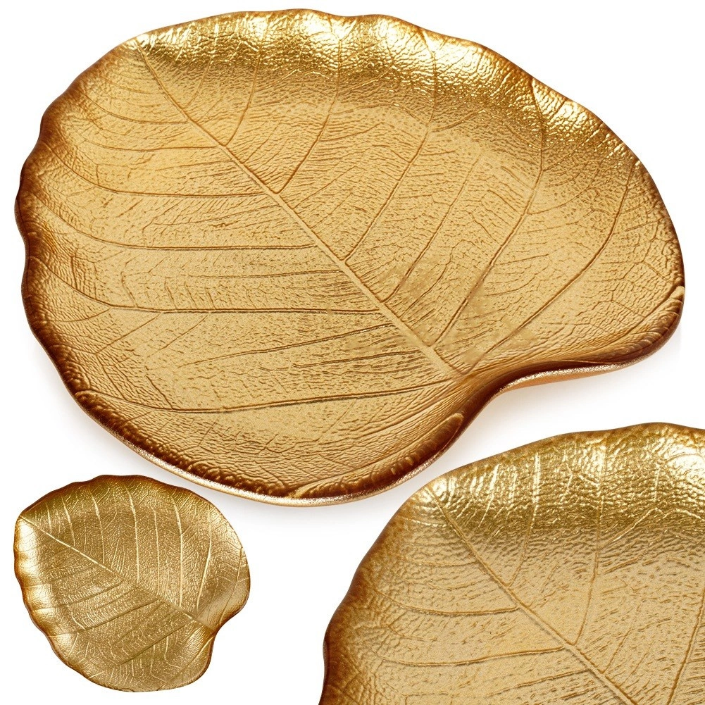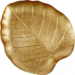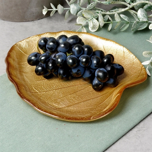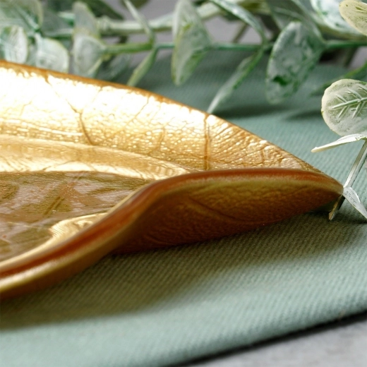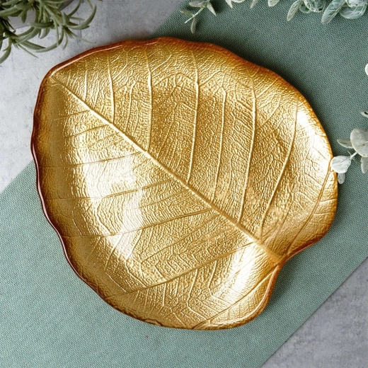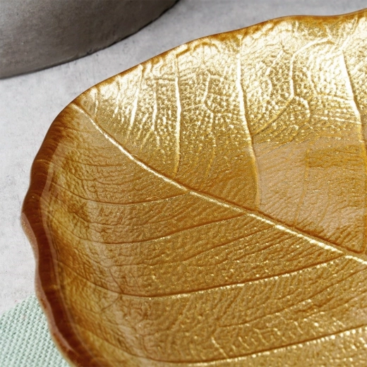 Creëer een sfeervolle setting met deze elegante bladvormige schaal in metallic goud. Hoogwaardig glas met reliëfnerf oogt luxueus en laat zich gemakkelijk combineren met zowel modern als klassiek tafelen. Het compacte formaat van 18 × 16 × 2 cm is ideaal voor kleine hapjes en decoratie.