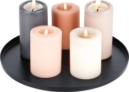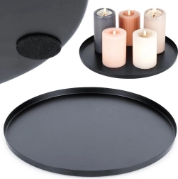 Deze hoogwaardige metalen onderzetter in mat zwarte afwerking is perfect voor het schikken van kaarsen, decoraties of sieraden. De diameter van 30 cm en de licht verhoogde rand zorgen voor stabiliteit en beschermen oppervlakken tegen was en vuil. Dankzij de tijdloze uitstraling combineert hij moeiteloos met uiteenlopende interieurstijlen.