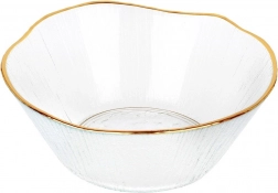 Deze stijlvolle glazen kom met gouden rand valt op door het moderne design en het subtiel gestructureerde oppervlak dat aan kristal doet denken. Het transparante glas benadrukt prachtig de kleuren van de geserveerde gerechten en geeft iedere tafel een vleugje luxe.