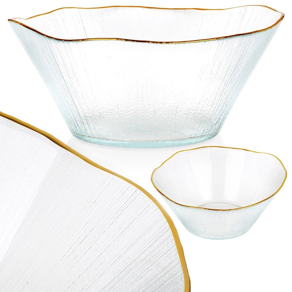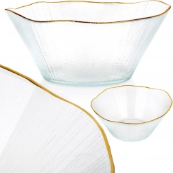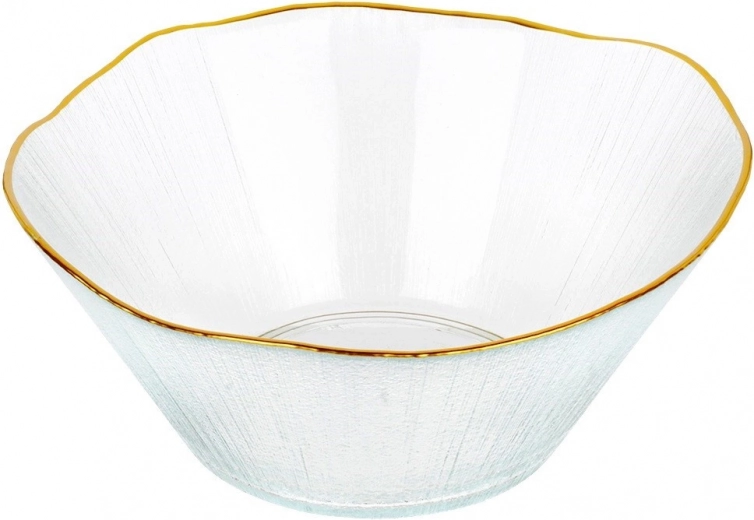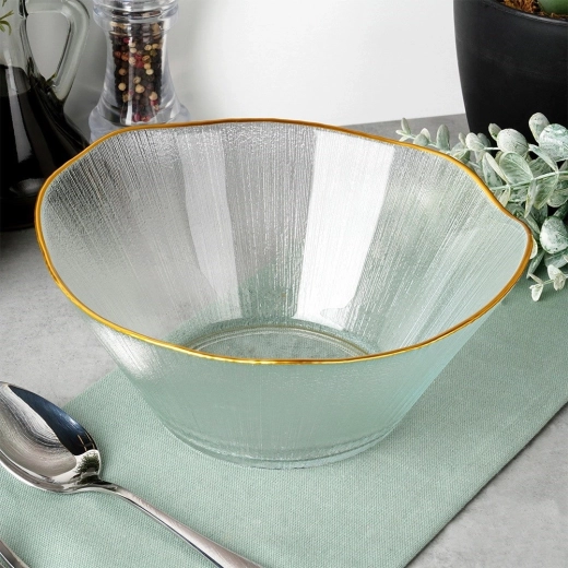 Deze stijlvolle kom van helder glas met een kristalachtige textuur valt op door de luxueuze gouden rand en de brede, golvende boord, die het serveren een bijzonder karakter geeft. Met afmetingen van 21 × 20 × 9 cm en een inhoud van 1,2 l is ze ideaal voor het serveren van salades, fruit, snacks of bijgerechten.