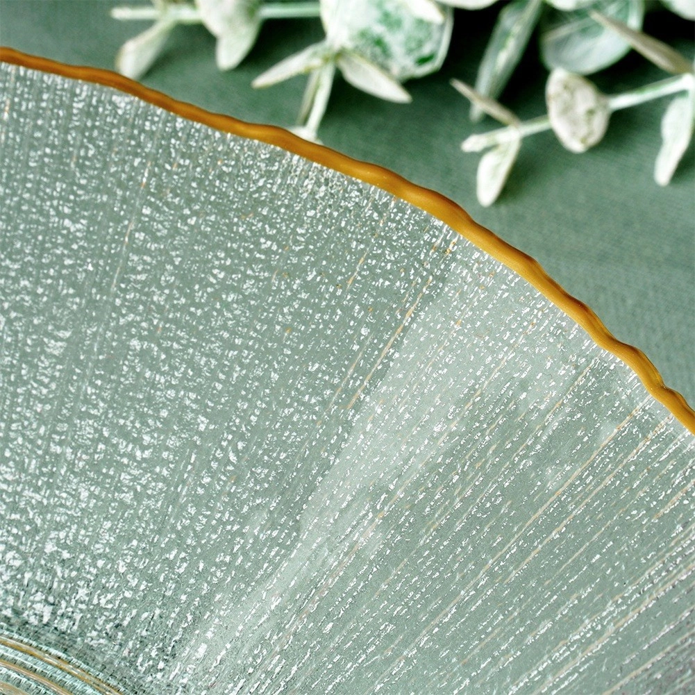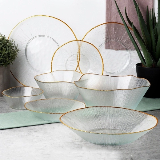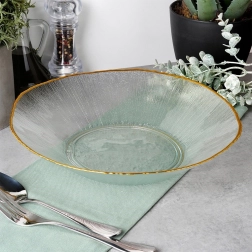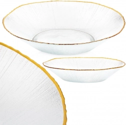 De vergulde rand geeft de kom een luxe uitstraling, terwijl het gestructureerde glas op kristal lijkt en de geserveerde gerechten accentueert.