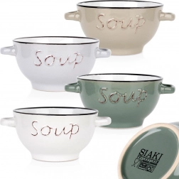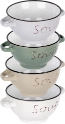 Elke kom heeft praktische zijhandgrepen voor veilig dragen. Hoogwaardige keramiek houdt warmte goed vast en is onderhoudsarm – de kommen kunnen in de vaatwasser en in de magnetron. De mix van vier neutrale kleuren (wit, beige, grijs, groen) past in zowel moderne als traditionele interieurs.