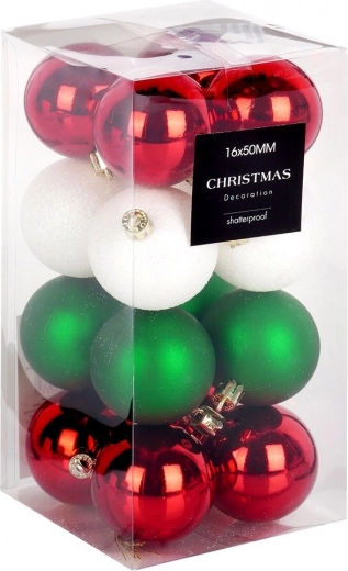 Set van 16 onbreekbare kerstballen in de kleuren rood, groen en wit geeft je decoratie een klassieke glans en een betoverende feestelijke sfeer. Elke ornament heeft een diameter van 5 cm en bevat glanzende, matte en glitter afwerkingen. Gemaakt van duurzaam plastic – veilig voor kinderen en huisdieren.
