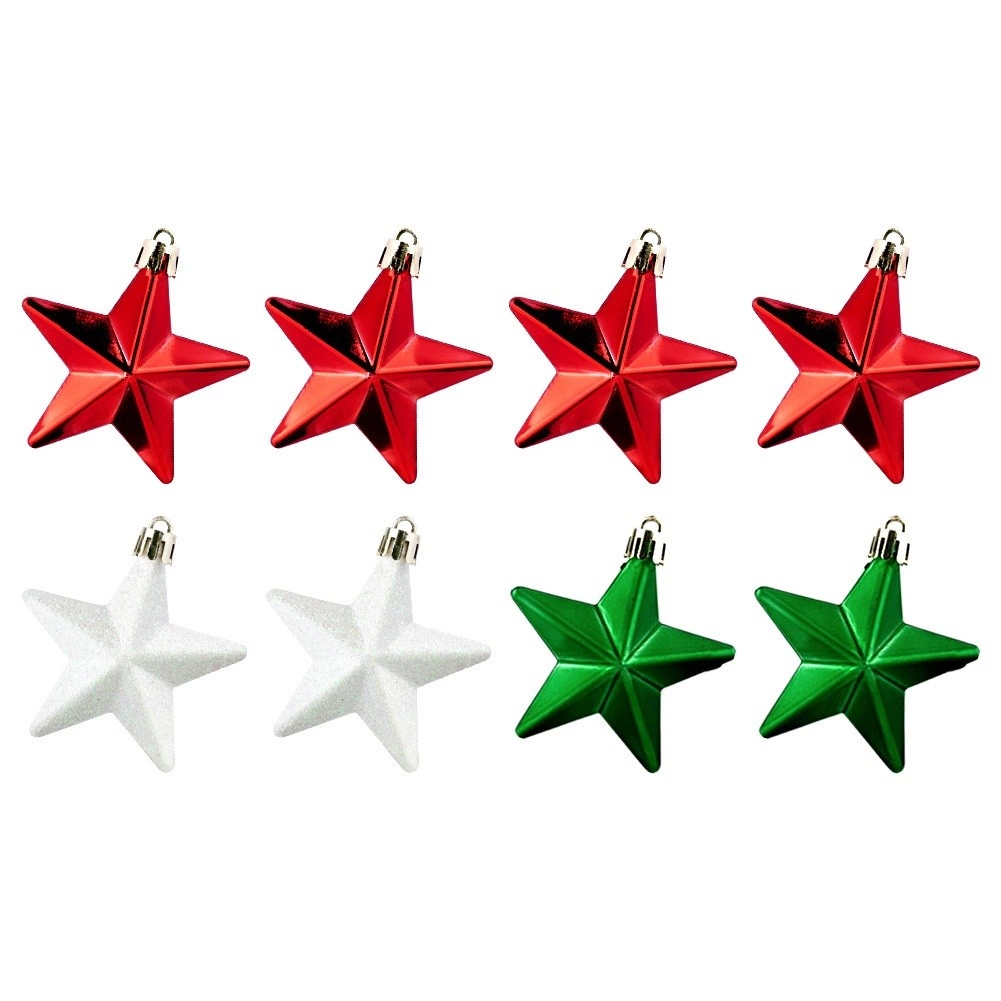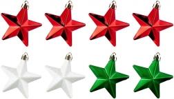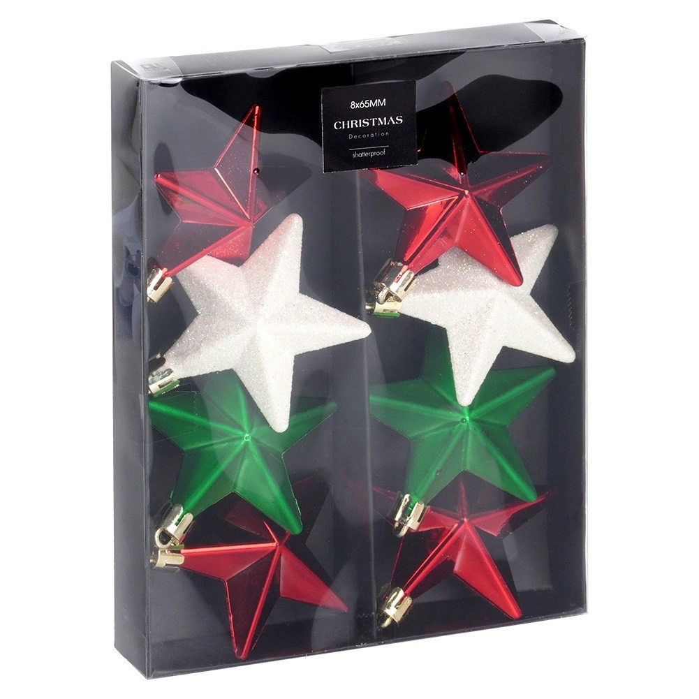 Breng een magische kerstsfeer in huis. De set bevat 8 duurzame sterren van hoogwaardige kunststof die het uiterlijk van glas natuurgetrouw nabootsen, maar veel veiliger en duurzamer zijn. De combinatie van drie afwerkingen – glans, mat en glitter – zorgt voor een opvallend contrast en weerspiegelt de lichtjes in de boom prachtig.