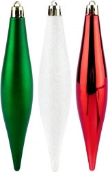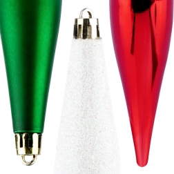 Creëer thuis een betoverende kerstsfeer met de decoratieve set van 4 druppelvormige ornamenten van 15 cm lang. Twee glanzend rode, één matgroene en één witte met glitter vormen samen een uitgebalanceerd kleuraccent in elke boom en feestelijke setting. Dankzij het onbreekbare materiaal lijken ze op glas, maar ze zijn aanzienlijk duurzamer en veiliger.