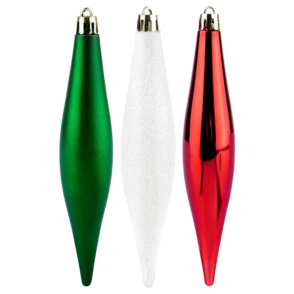 Twee glanzend rode, één matgroene en één witte druppel met glitter creëren een harmonisch contrast en accentueren je kerstdecoratie.