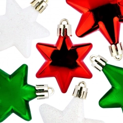 Glanzende, matte en glitterende sterren in rood, groen en wit creëren een harmonieuze, feestelijke compositie en geven de boom klassieke kerstsfeer.