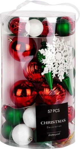 Stijlvolle set van 57 onbreekbare kerstornamenten in rood, groen en wit die elke boom laat stralen. De mix van glanzende, matte, glitterende en reliëfoppervlakken zorgt voor een rijke, klassieke look. De ornamenten van duurzaam plastic zijn veilig voor kinderen en huisdieren, hebben oogjes voor eenvoudig ophangen en worden geleverd in een praktische opbergverpakking.