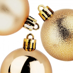 Elke bal heeft een metalen dop met oogje en in de verpakking vind je ook gouden ophangkoordjes.