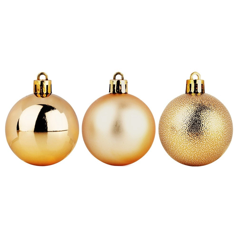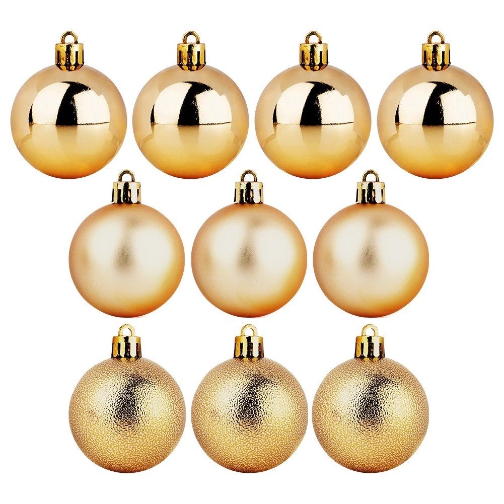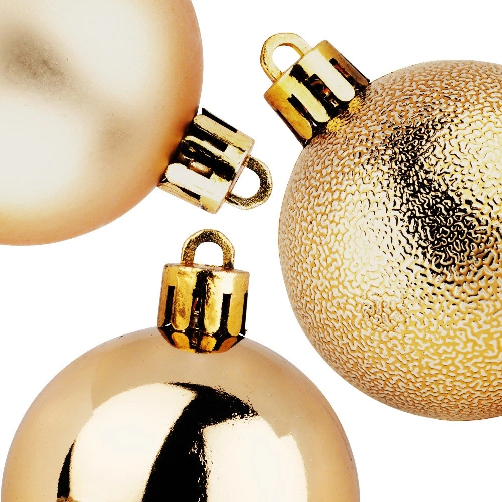 Creëer thuis een betoverende feestelijke sfeer met deze set gouden kerstballen, die drie afwerkingen combineert: glans, mat en gestructureerde glitter. Het duurzame, onbreekbare design lijkt op glas, maar is veel veiliger en duurzamer.