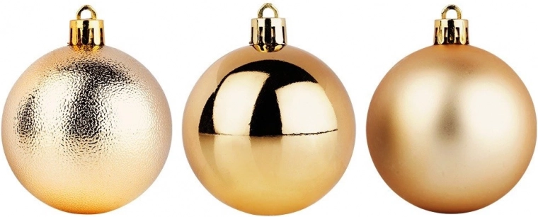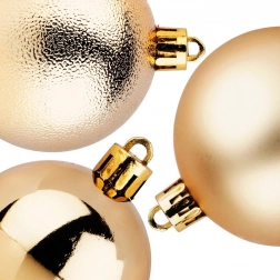 Glanzende, matte en gestructureerde ballen in dezelfde goudtint zorgen voor een harmonieuze en toch opvallende uitstraling van je feestdecoratie.
