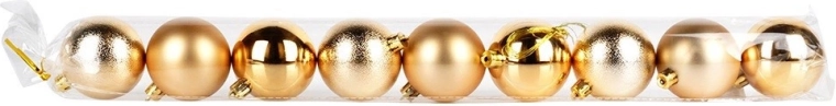 Een elegante set van 9 kerstballen in goud met een diameter van 6 cm geeft je decoratie een klassieke glans en een feestelijke sfeer. De set bevat glanzende, matte en gestructureerde afwerkingen in één uniforme goudtint. De ballen zijn onbreekbaar, gemaakt van hoogwaardig kunststof, veilig voor huishoudens met kinderen en huisdieren, en in de verpakking zitten koordjes om op te hangen.