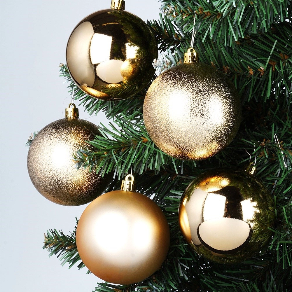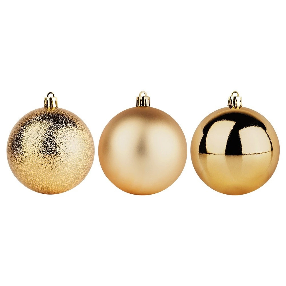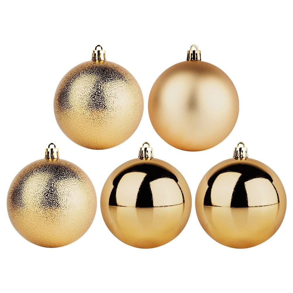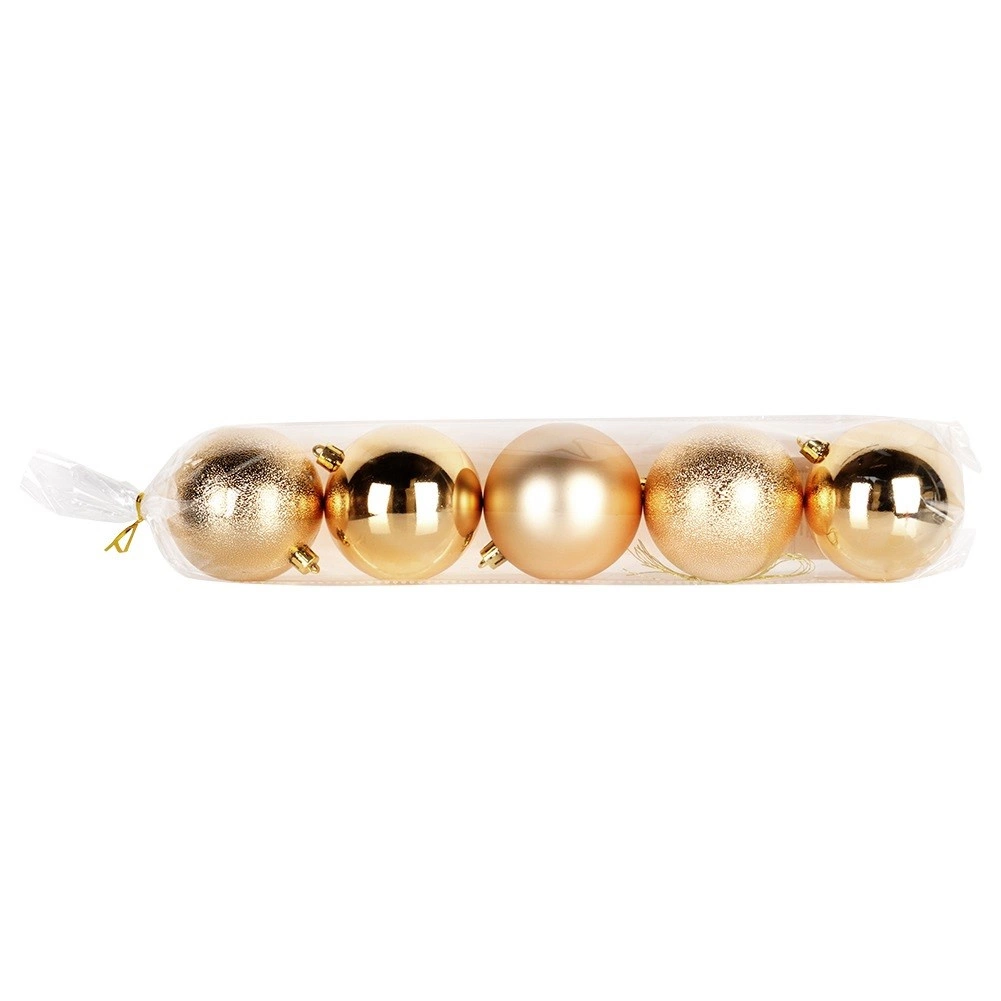 Breng harmonie en glans in je kerstdecor met een set van 5 gouden ballen met een diameter van 8 cm. Het duurzame, onbreekbare design lijkt op glas, maar biedt meer veiligheid en een langere levensduur. De combinatie van glanzende, matte en gestructureerde afwerkingen zorgt voor een opvallend contrast en diepte in je decoratie.