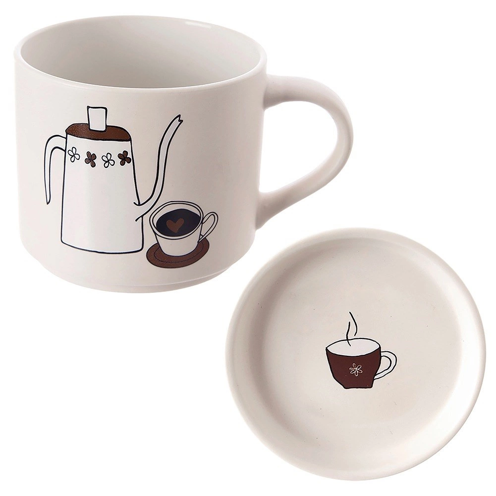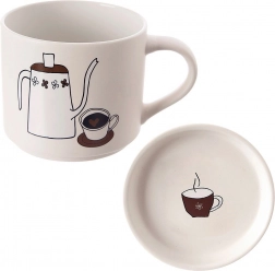 De subtiele illustratie van een theepot en kopje geeft elke tafel stijl; het deksel kan ook als schoteltje worden gebruikt.