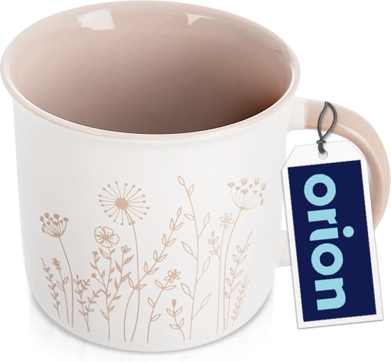 Elegante porseleinen mok met een inhoud van 400 ml en een klassiek design, witte buitenkant en een beige binnenkant en oor. Geschikt voor de vaatwasser en de magnetron, ideaal voor koffie, thee of cacao. Decor met weidebloemen en een comfortabel ergonomisch oor voor dagelijks gebruik.