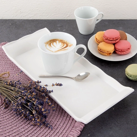 Het elegante witte serveerblad maakt het dragen van koffie, thee, desserts en kleine hapjes eenvoudig. Hogere golvende randen en een comfortabele grip helpen ongewenst wegglijden en morsen te voorkomen. Perfect voor dagelijks gebruik en feestelijke gelegenheden.
