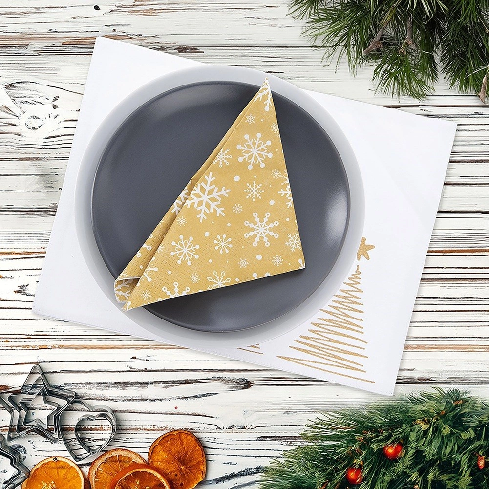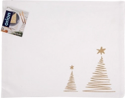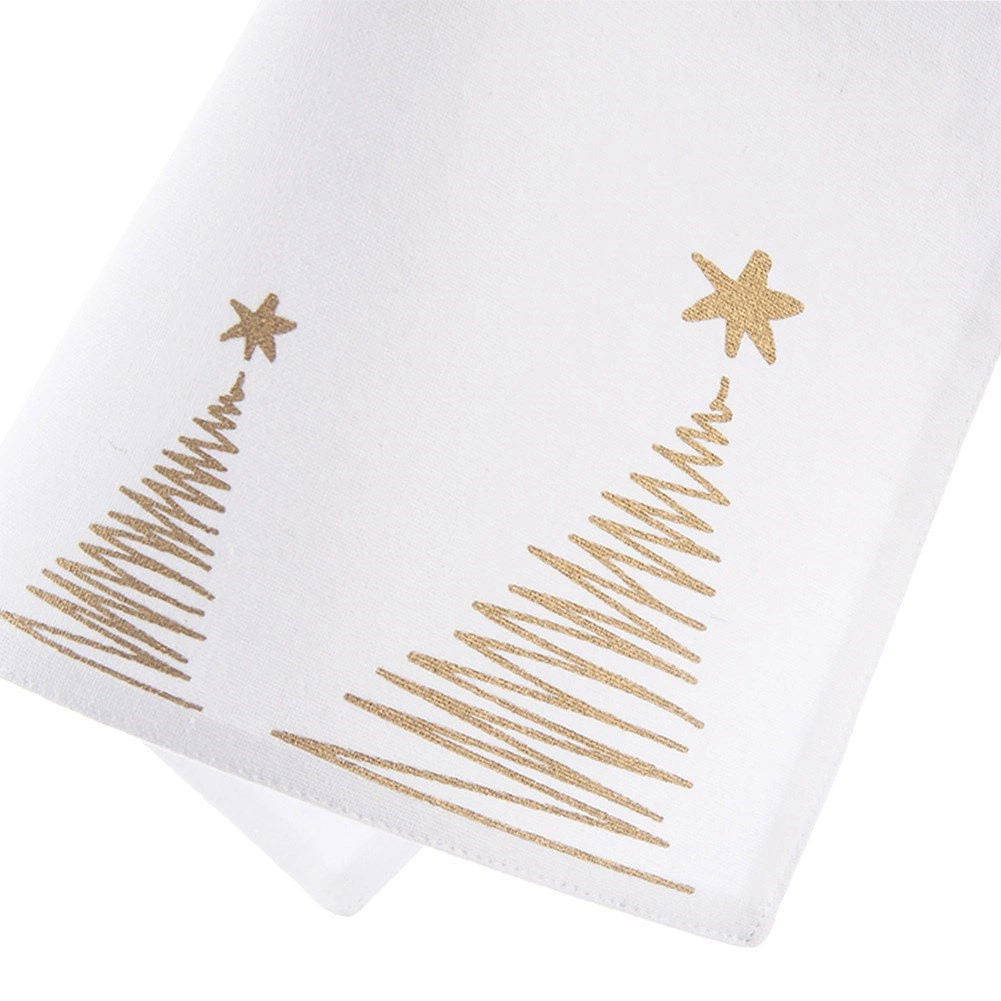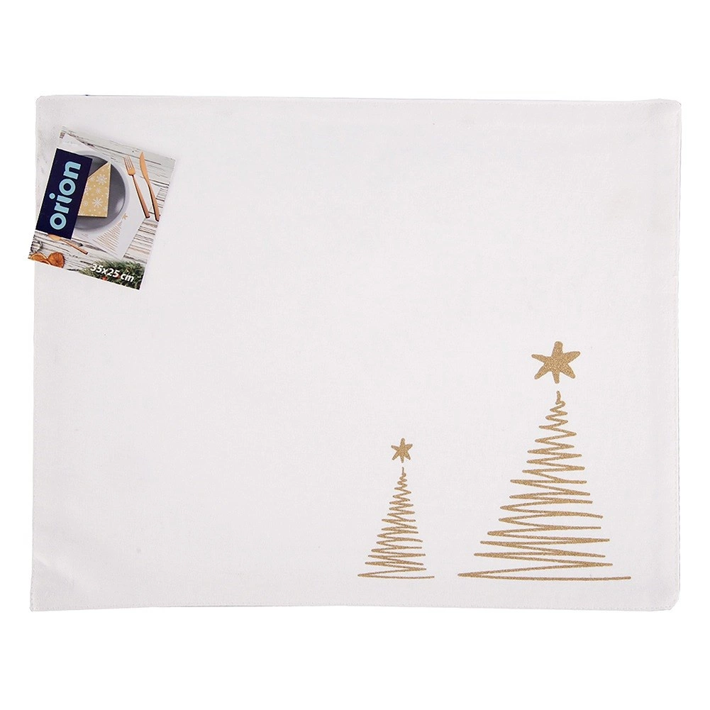 Deze katoenen placemat verandert elke feestelijke én dagelijkse tafel. De witte basis met een gouden motief van kerstbomen creëert een harmonische en elegante setting om te serveren. Dankzij de afmetingen 33,5 × 26 cm past hij perfect onder borden, kopjes en dessertbordjes en zorgt hij voor een uniforme look op tafel.