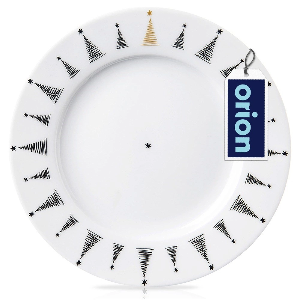 Breng een feestelijke sfeer aan uw tafel met dit porseleinen dessertbord met een diameter van 20 cm. Het witte geglazuurde oppervlak is versierd met minimalistische boompjes in zwart en goud, wat modern en tijdloos oogt. Het bord is ideaal voor taartjes, gebak, fruit en kleinere hartige hapjes.
