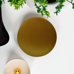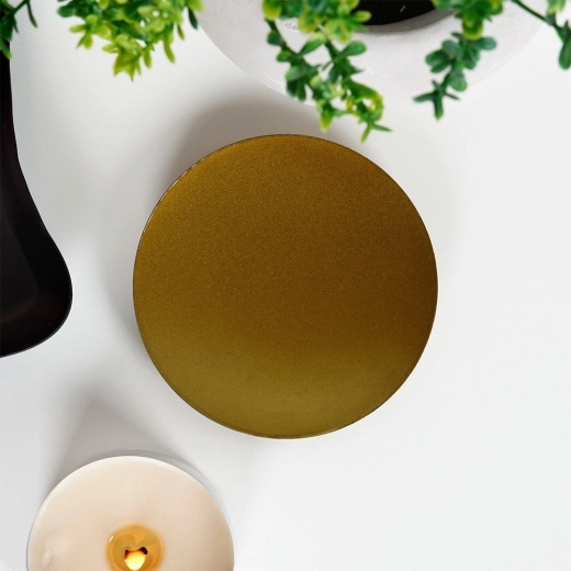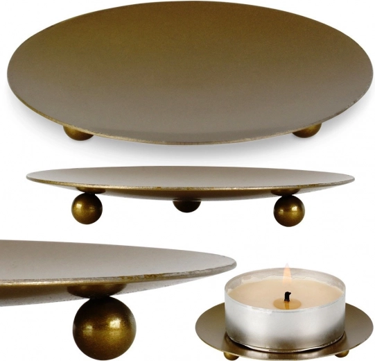 Ontdek een stijlvolle en functionele toevoeging aan je interieur – een metalen kaarsenhouder in mat goud. Het lage schaaltje op drie bolvormige pootjes zorgt voor uitstekende stabiliteit en een lichte verhoging van het oppervlak, wat helpt warmte af te voeren en meubels te beschermen tegen kaarsvet en hitte. Het minimalistische uiterlijk laat zich makkelijk combineren met elke interieurstijl.