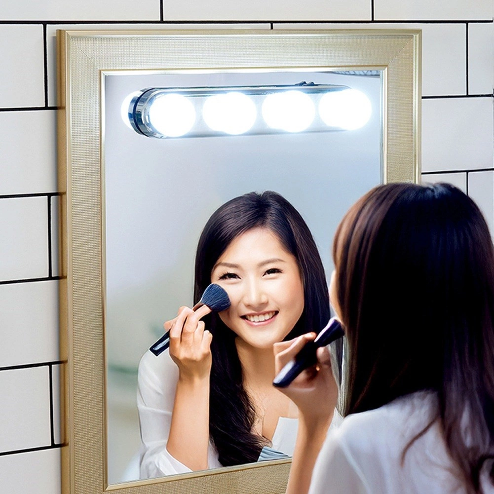 Vier bolvormige LED-lampen zorgen voor helder, gelijkmatig licht zonder storende schaduwen – ideaal voor make-up en gedetailleerde verzorging.