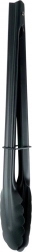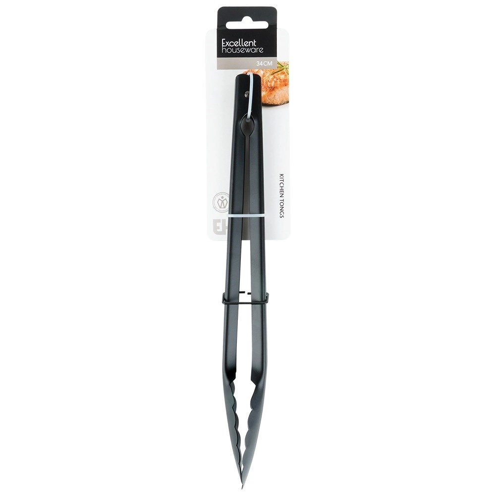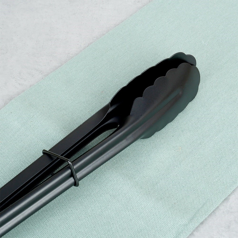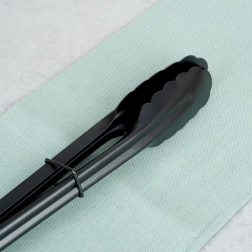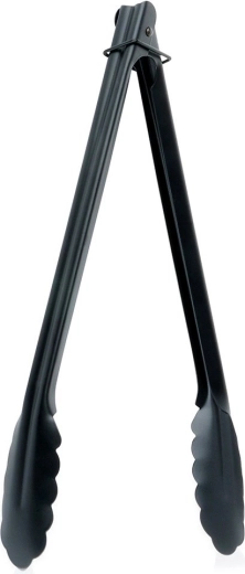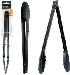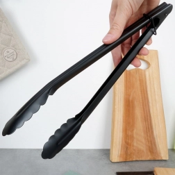 Universele keukentang in een modern zwart design, onmisbaar bij bakken, braden en grillen. De robuuste rvs-constructie zorgt voor een lange levensduur en hygiëne, terwijl de gevormde uiteinden vlees, groenten en brood betrouwbaar vastpakken zonder weg te glijden.