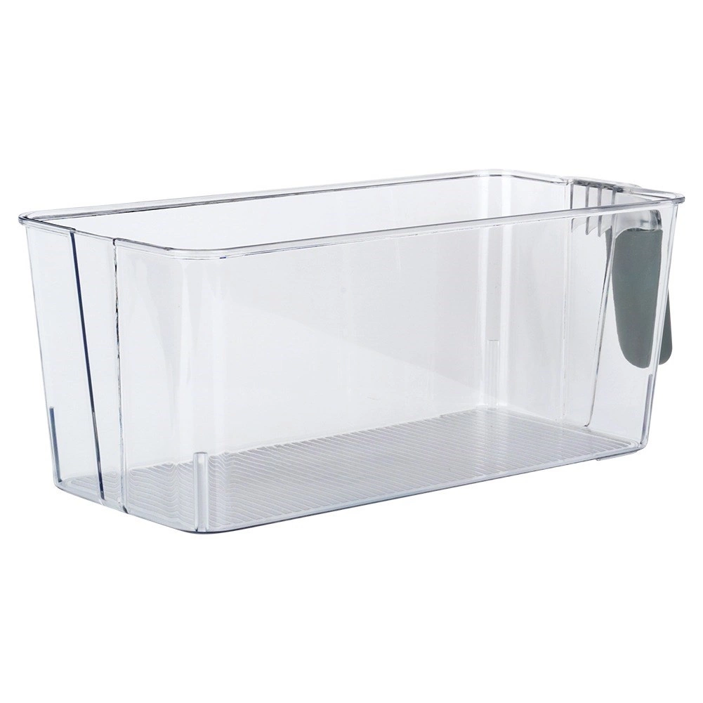 Deze duurzame en stevige organizer van transparant plastic met grijze siliconen handgreep is ideaal voor het overzichtelijk opbergen van fruit, groenten en andere etenswaren in de koelkast, voorraadkast of op planken. Transparante wanden zorgen voor direct zicht op de inhoud en de geribbelde bodem helpt schuiven en vocht te verminderen.