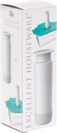 Compacte handmatige vacuümpomp van 13,5 cm voor het snel vacuümzuigen van lucht uit vacuümzakken en -containers. Door het creëren van een vacuümafsluiting helpt hij voedsel langer vers te houden, smaak, vitaminen en voedingsstoffen te behouden en voedselverspilling te verminderen. Licht, ergonomisch en eenvoudig te bedienen; de rubberen basis zorgt voor een nauwe afdichting en stabiliteit tijdens gebruik.