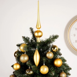 Alles wat je nodig hebt voor een snelle en stijlvolle versiering – ballen in twee formaten, 2 druppels en een decoratieve piek. Handige ophanglusjes voor eenvoudig plaatsen.