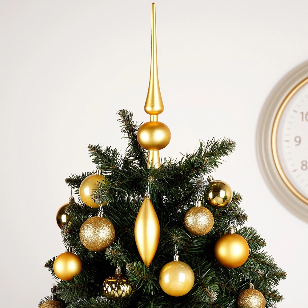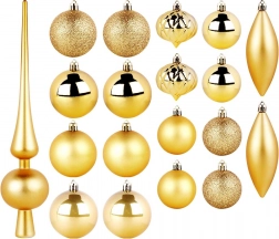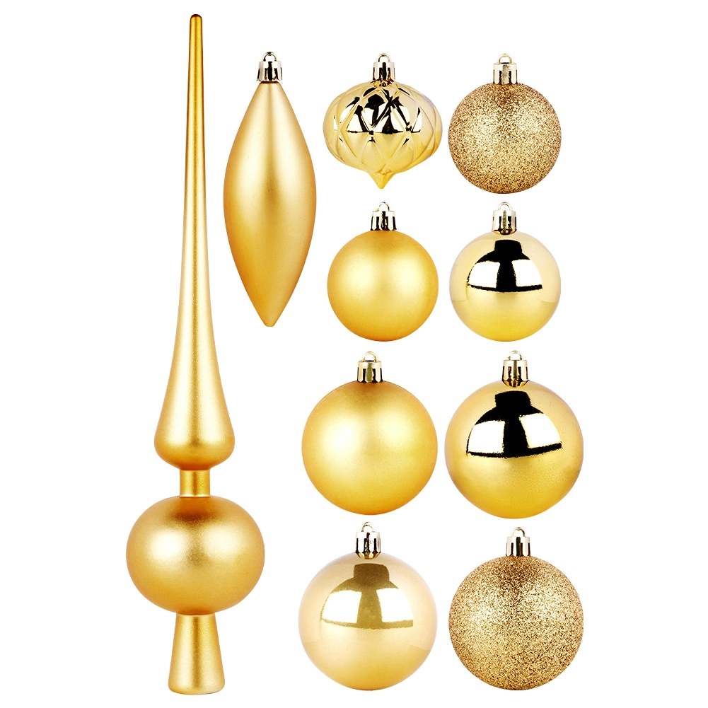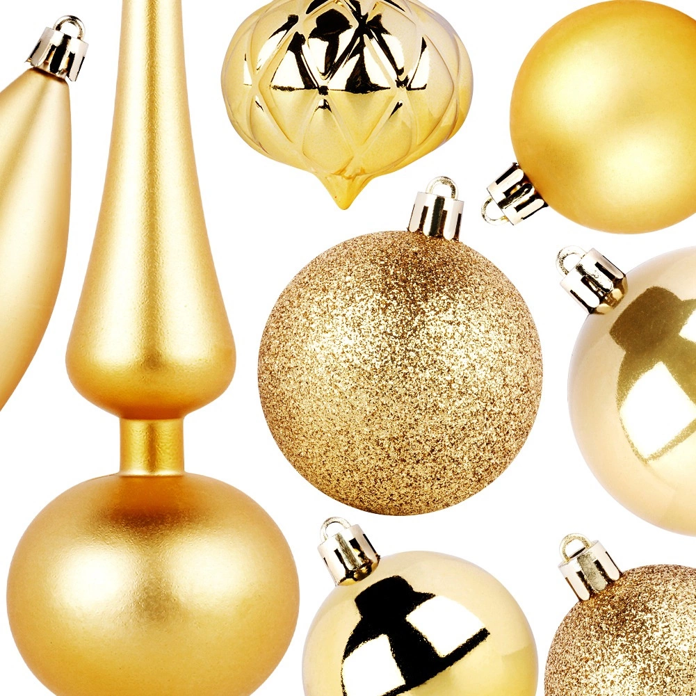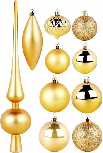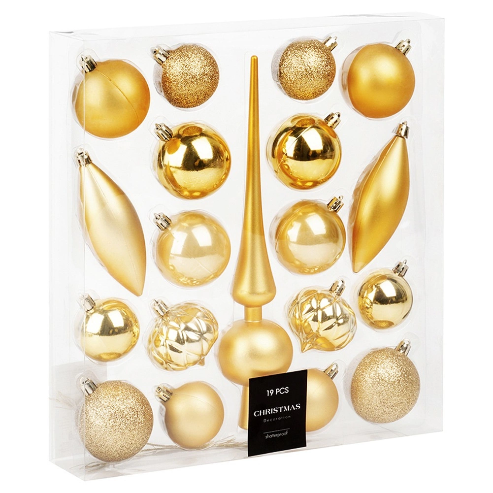 Deze veelzijdige set van 19 gouden ornamenten combineert verschillende vormen en afwerkingen voor een rijke en evenwichtige uitstraling van de boom. Je vindt er matte, glanzende, parelmoer- en glinsterende ballen in, een elegante piek en een paar druppelornamenten. Het lichte en duurzame materiaal zorgt voor betrouwbaarheid en een lange levensduur zonder risico op breuk.