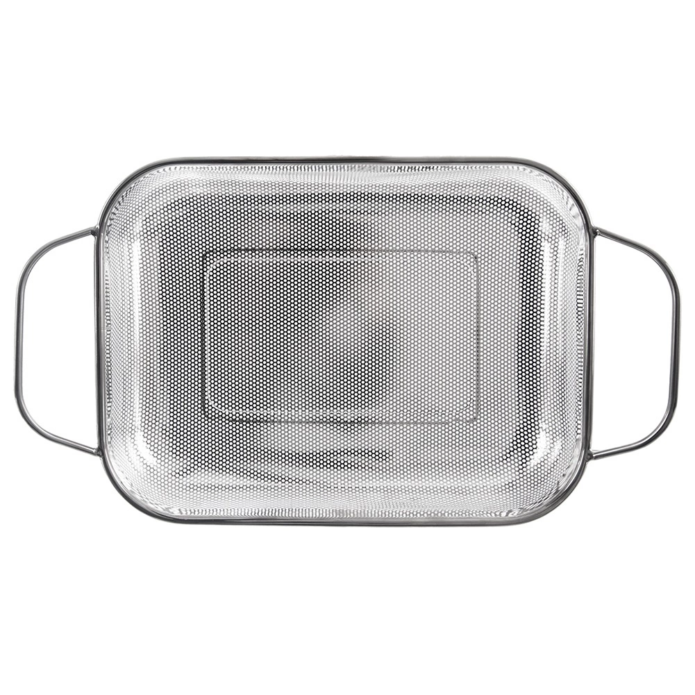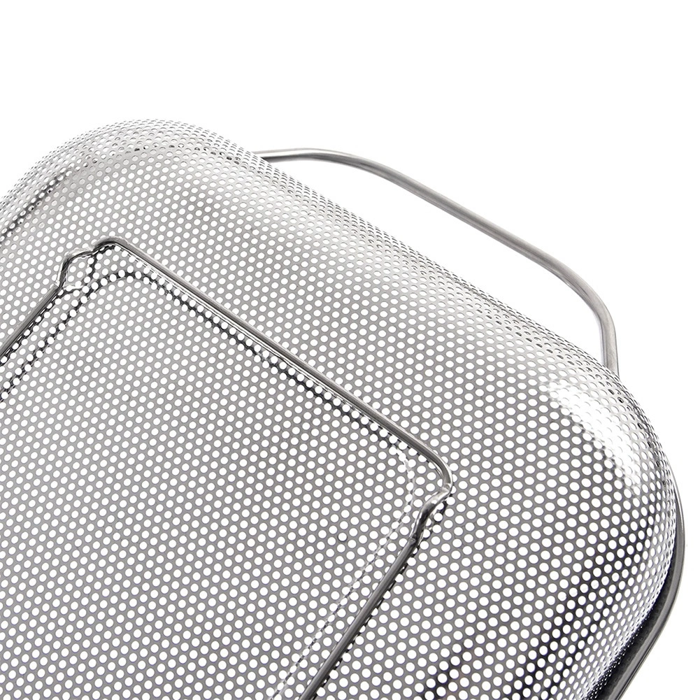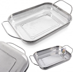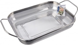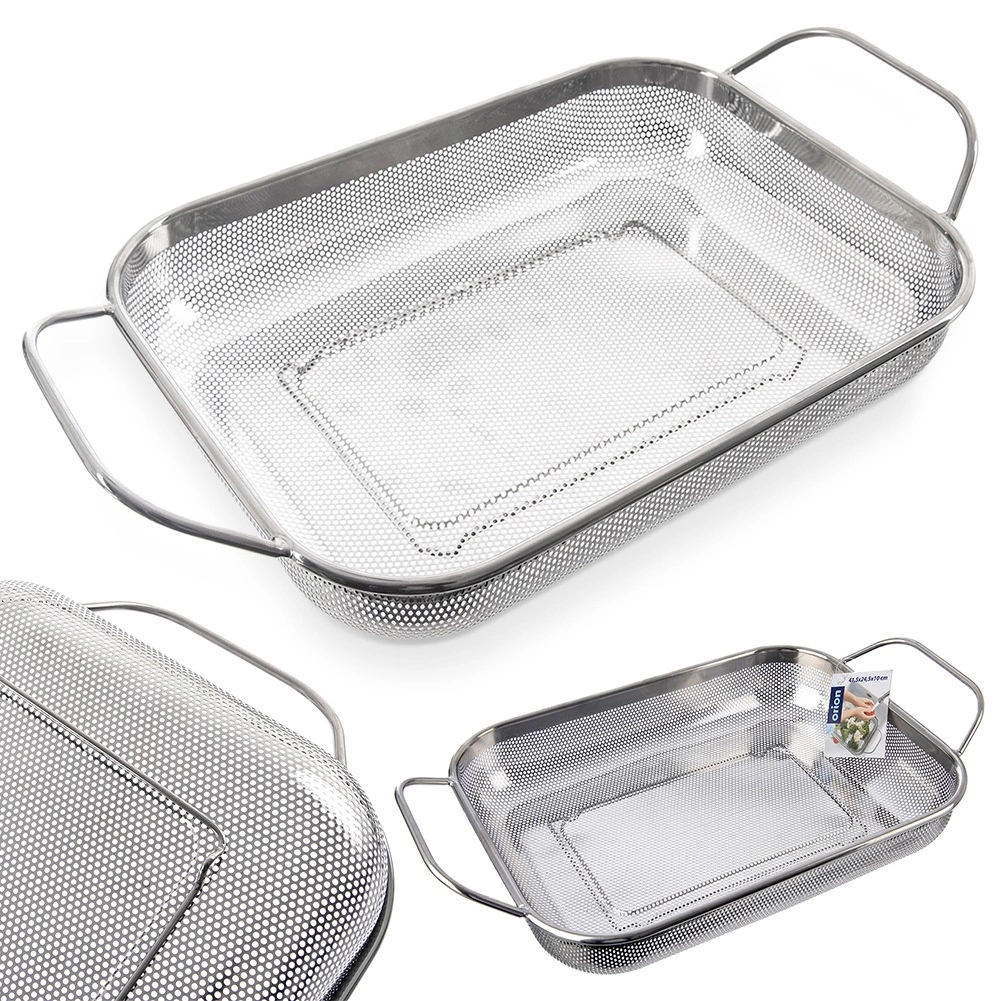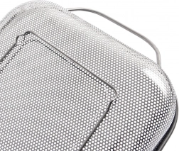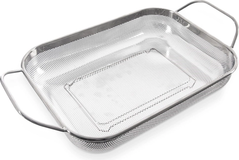 De mand dient als vergiet boven de spoelbak en als grillmand. De perforatie laat warmte en rook door, terwijl het voedsel niet doorvalt.