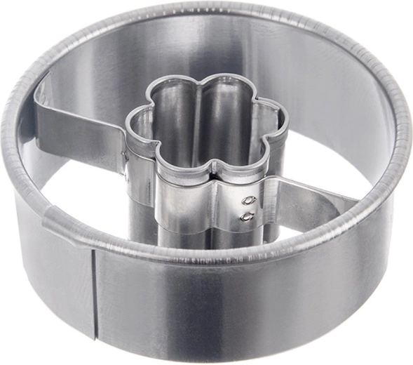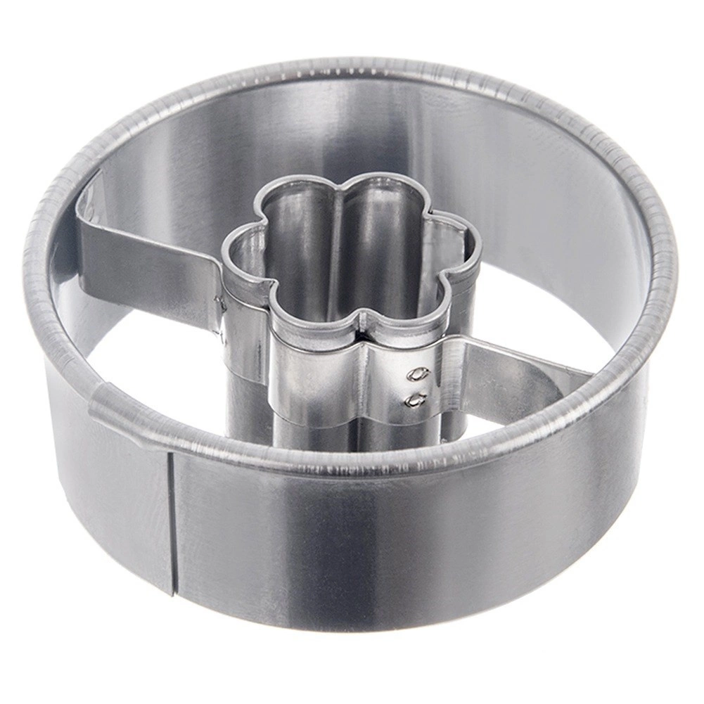 Praktische roestvrijstalen uitsteekvorm in de vorm van een cirkel met een bloemvormige opening in het midden voor het eenvoudig maken van originele koekjes en peperkoek. Dankzij het midden kun je de koekjes vullen met jam of chocolade. Duurzaam roestvrij staal, universele inzetbaarheid en eenvoudig te reinigen in de vaatwasser maken het tot een geweldige hulp bij elk bakproject.