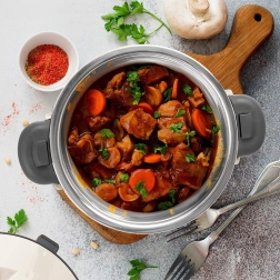 De binnenkant van roestvrij staal slaat warmte of kou op en helpt gerechten langer op de ideale temperatuur te houden. Makkelijk te reinigen en bestand tegen geurtjes.