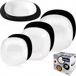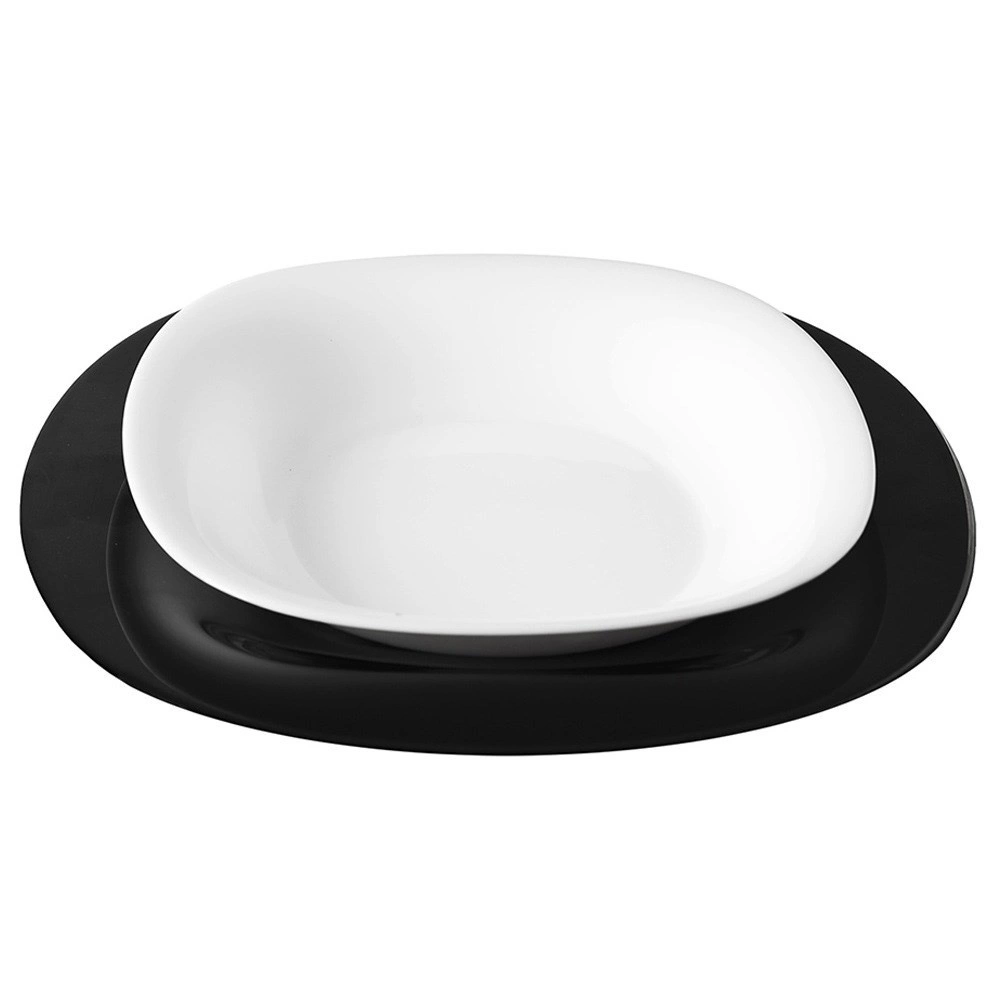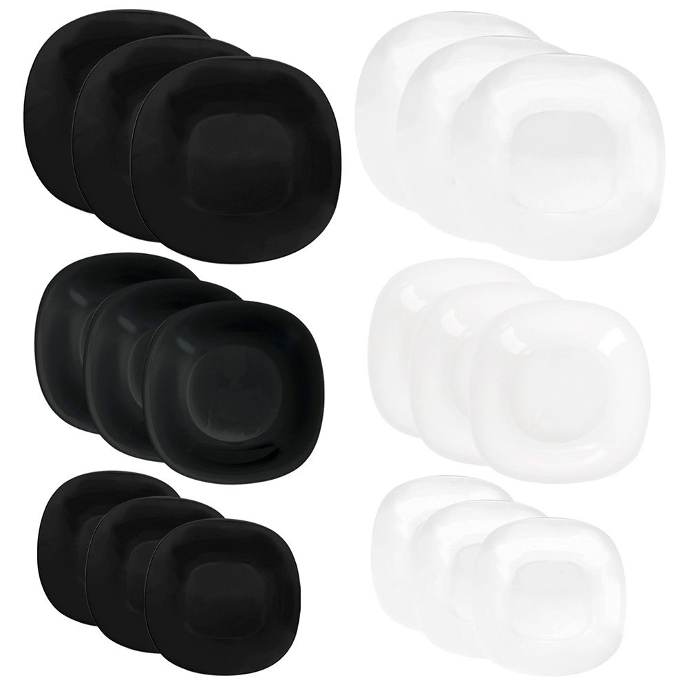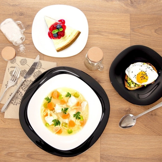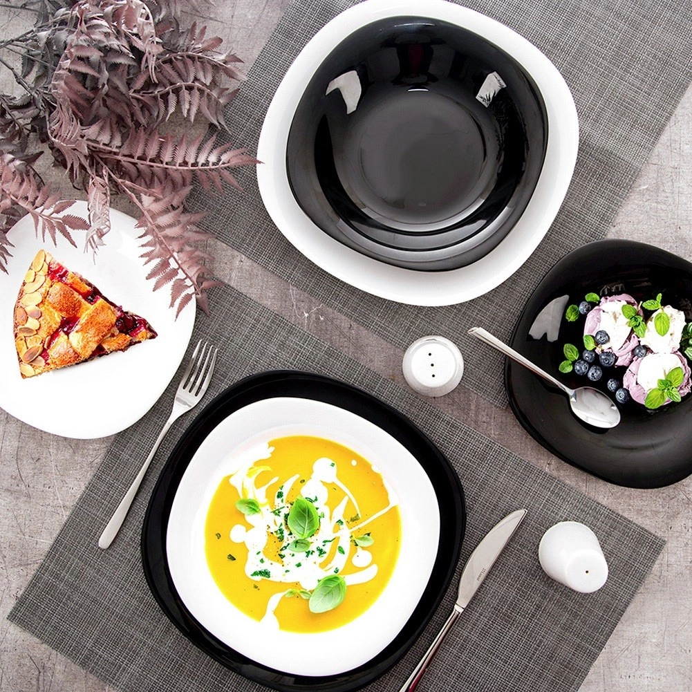 In de verpakking vindt u alles voor een complete tafel: 6 dessertbordjes, 6 diepe borden en 6 platte borden in een harmonische mix van wit en zwart. De afgeronde vierkante lijnen geven het dekken een modern accent en besparen tegelijk ruimte bij het stapelen.