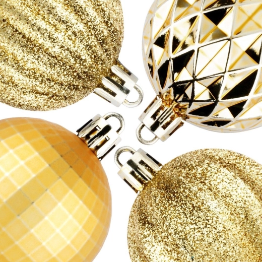 Elegante set van 24 gouden kerstballen met een diameter van 5 cm in verschillende afwerkingen – glanzend, mat, brokaat en gestructureerd. Gemaakt van onbreekbaar kunststof voor extra veiligheid in huishoudens met kinderen en huisdieren, inclusief koordjes voor eenvoudig ophangen.