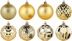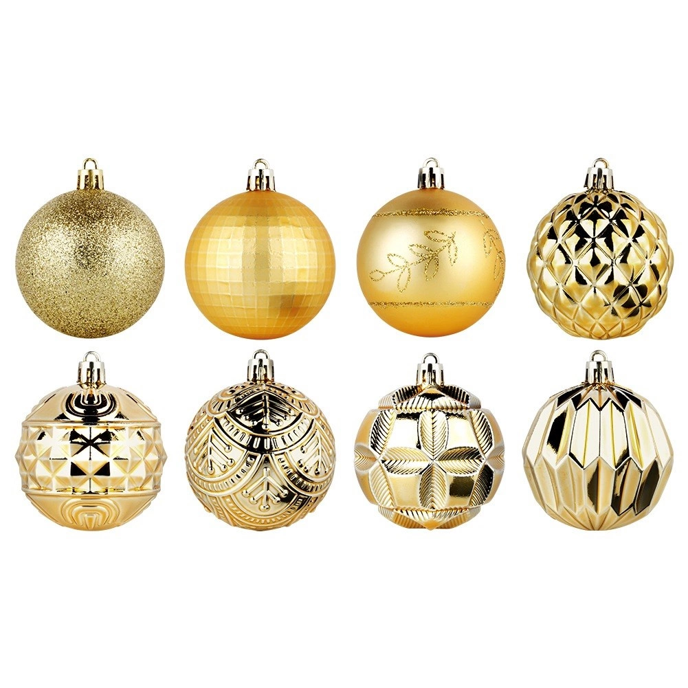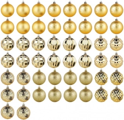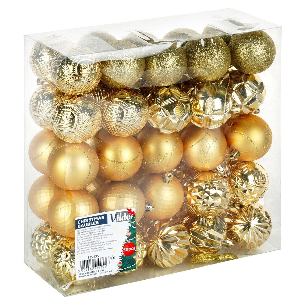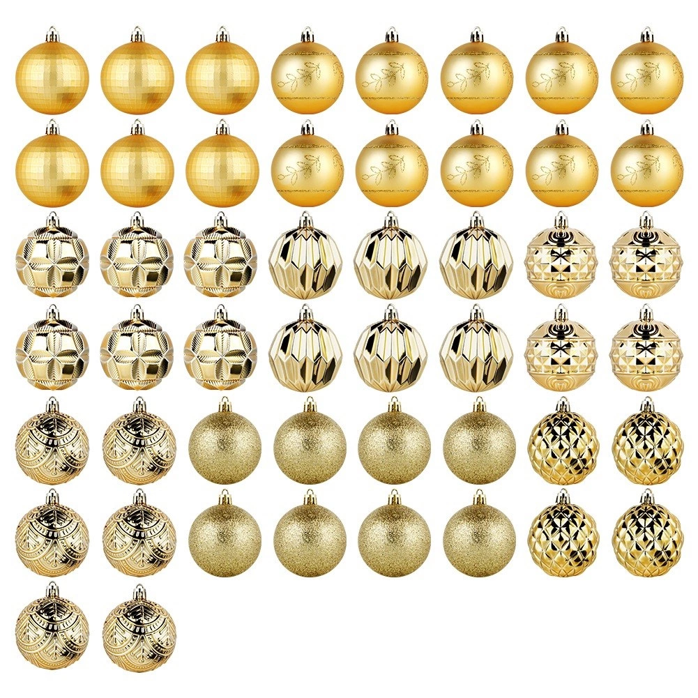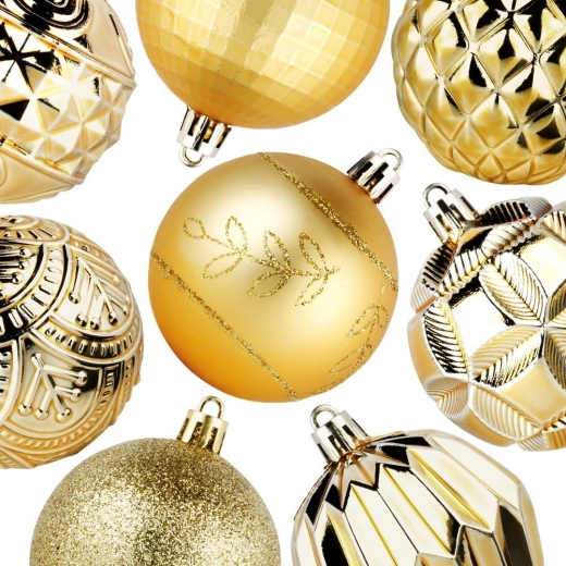Creëer een betoverende kerstdecoratie met deze royale set van 50 stuks in een uniforme gouden tint. De ornamenten ogen luxe en geven dankzij de verschillende texturen en decoraties diepte en sprankeling aan de boom en arrangementen. Ze zijn gemaakt van een duurzaam materiaal dat op glas lijkt, maar veiliger en duurzamer is.
