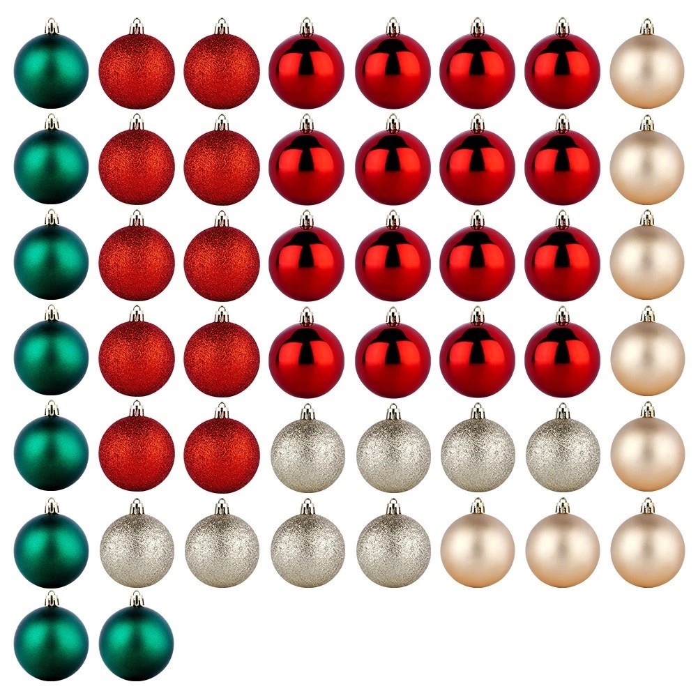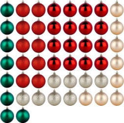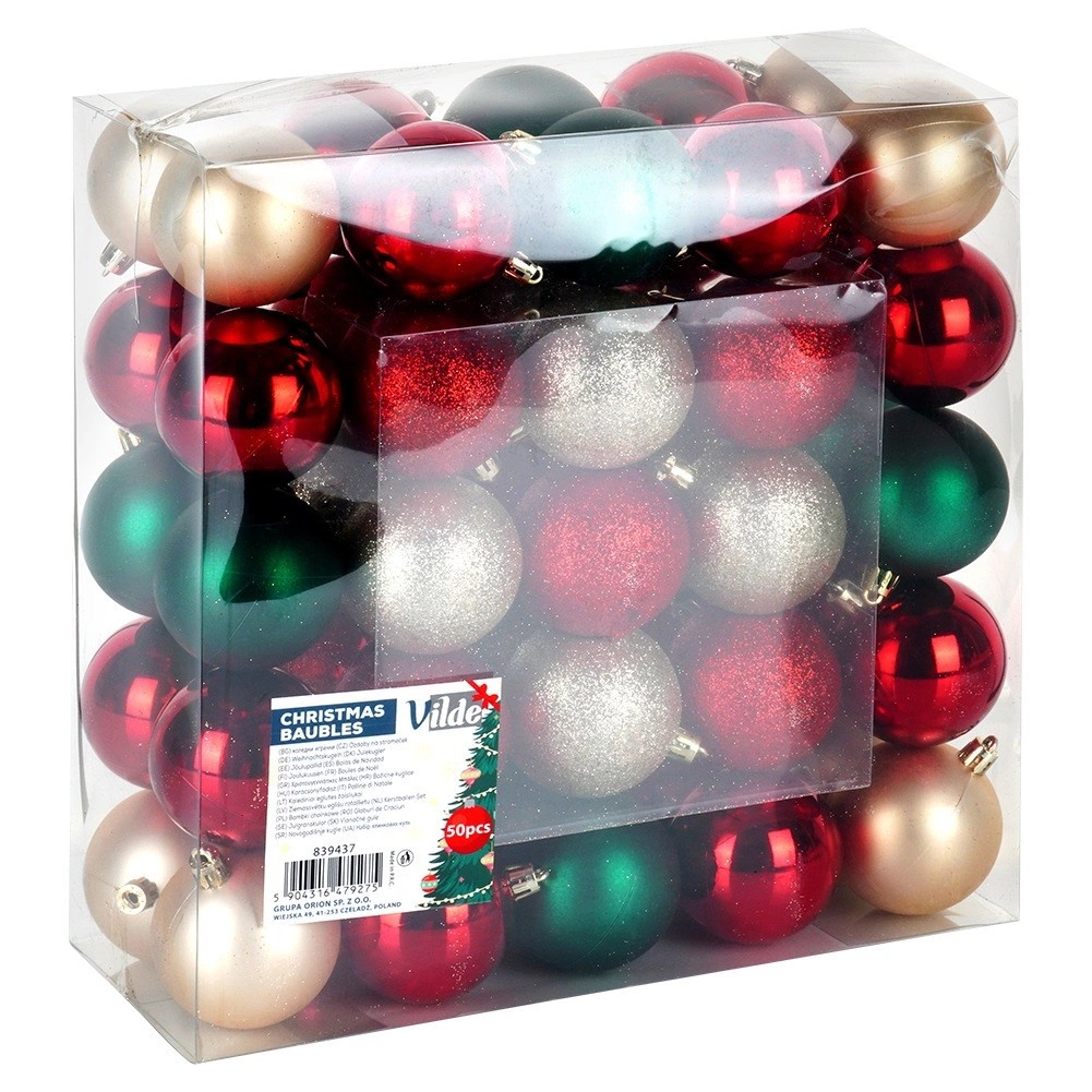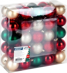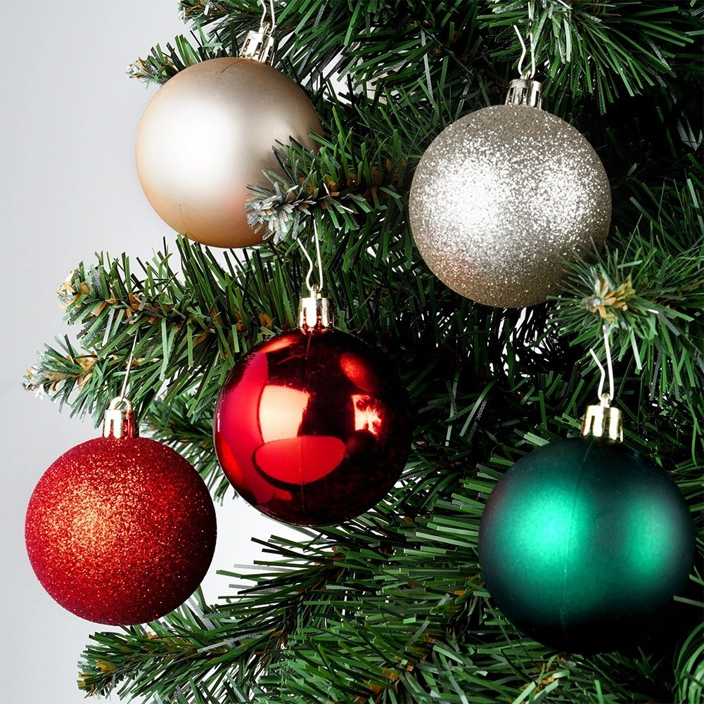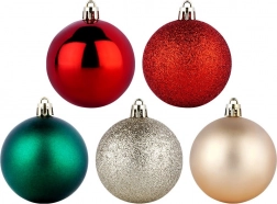 In de verpakking vind je zorgvuldig op elkaar afgestemde combinaties voor eenvoudig versieren: rode matte en glanzende, champagnekleurige matte en glitter en groene matte ballen. Dankzij de uniforme diameter van 6 cm combineren ze perfect en vullen ze de boom van top tot onderste takken.