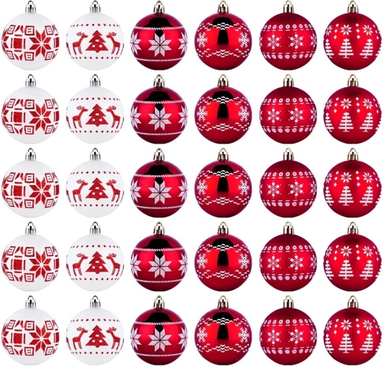 Creëer thuis een magische feestelijke sfeer met een set van 30 onbreekbare kerstballen met een diameter van 6 cm in rood en wit. De combinatie van glanzende en matte ballen met stijlvolle motieven geeft de boom een klassieke uitstraling, en het veilige ontwerp van duurzaam plastic is ideaal voor huishoudens met kinderen en huisdieren. Inclusief touwtjes om op te hangen.