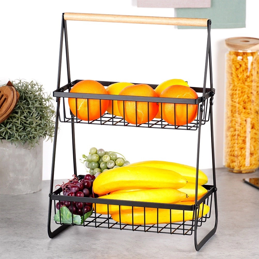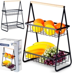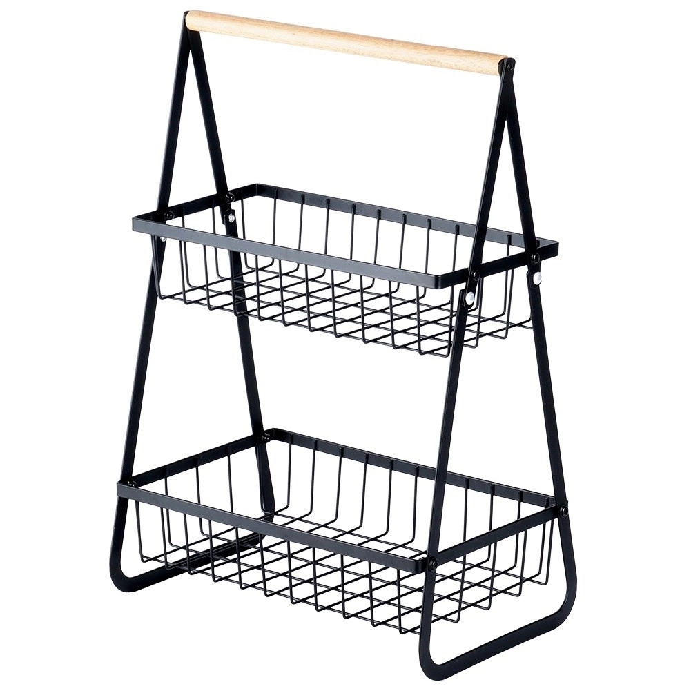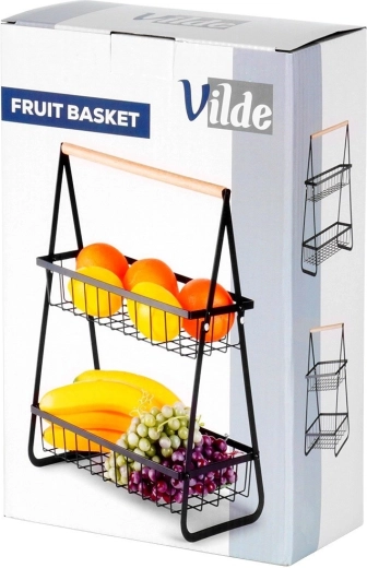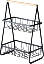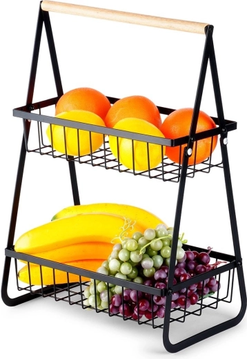Stijlvolle tweelaagse mand voor fruit en groenten in het zwart combineert ruimtebesparing, een stevige metalen constructie en een praktisch houten handvat voor gemakkelijk dragen. De open draadmanden zorgen voor een uitstekende luchtcirculatie en goed zicht op de inhoud, zodat je producten langer vers blijven en mooi uitkomen op het aanrecht of in de kast.