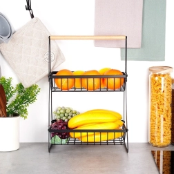 De tweelaagse organizer met een strak industrieel loft-design bespaart ruimte op het aanrecht en houdt fruit en groenten netjes bij elkaar. Het robuuste matzwarte metaal is stabiel en duurzaam, terwijl het bovenste houten handvat het verplaatsen van plek naar plek vergemakkelijkt.