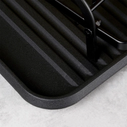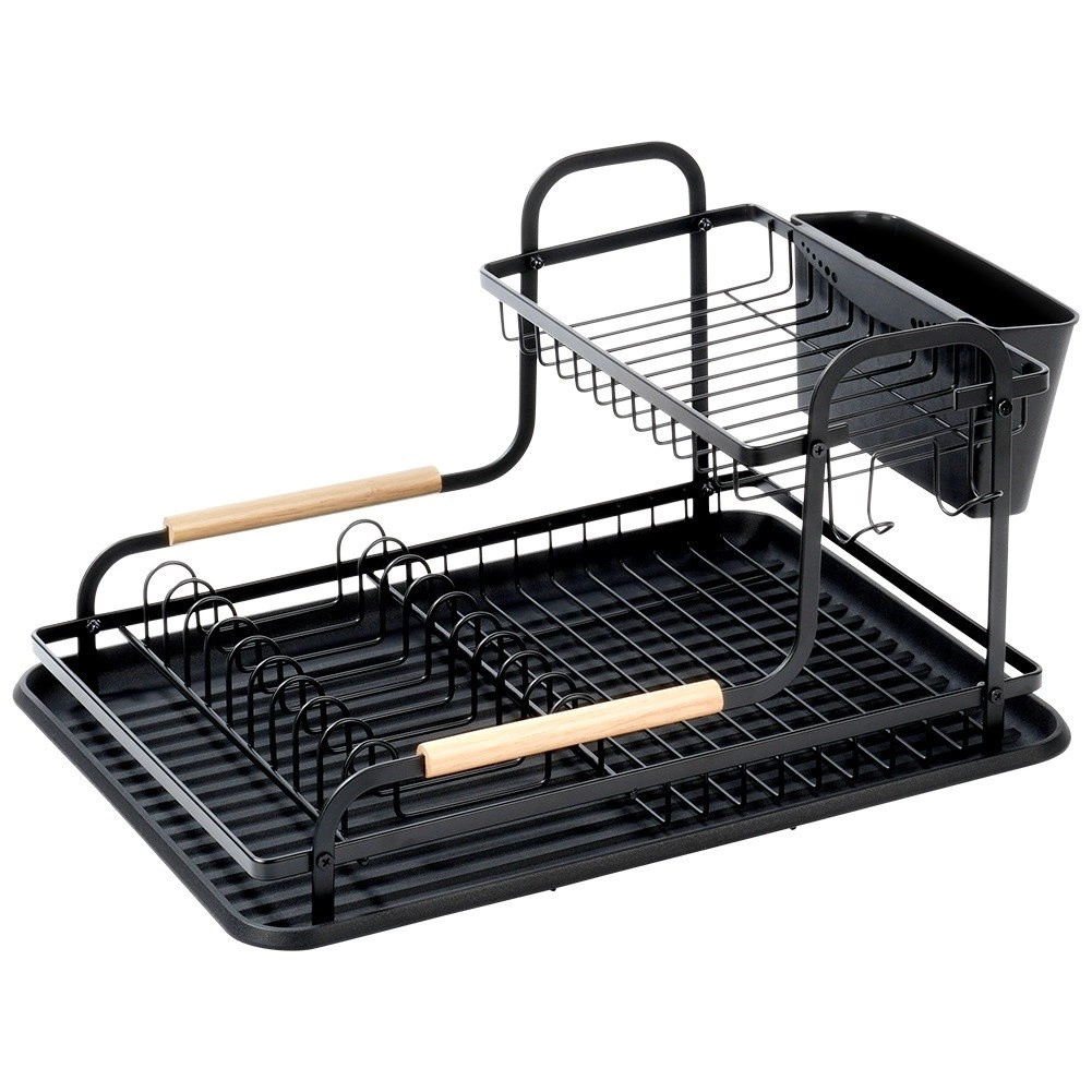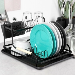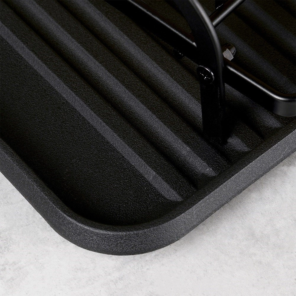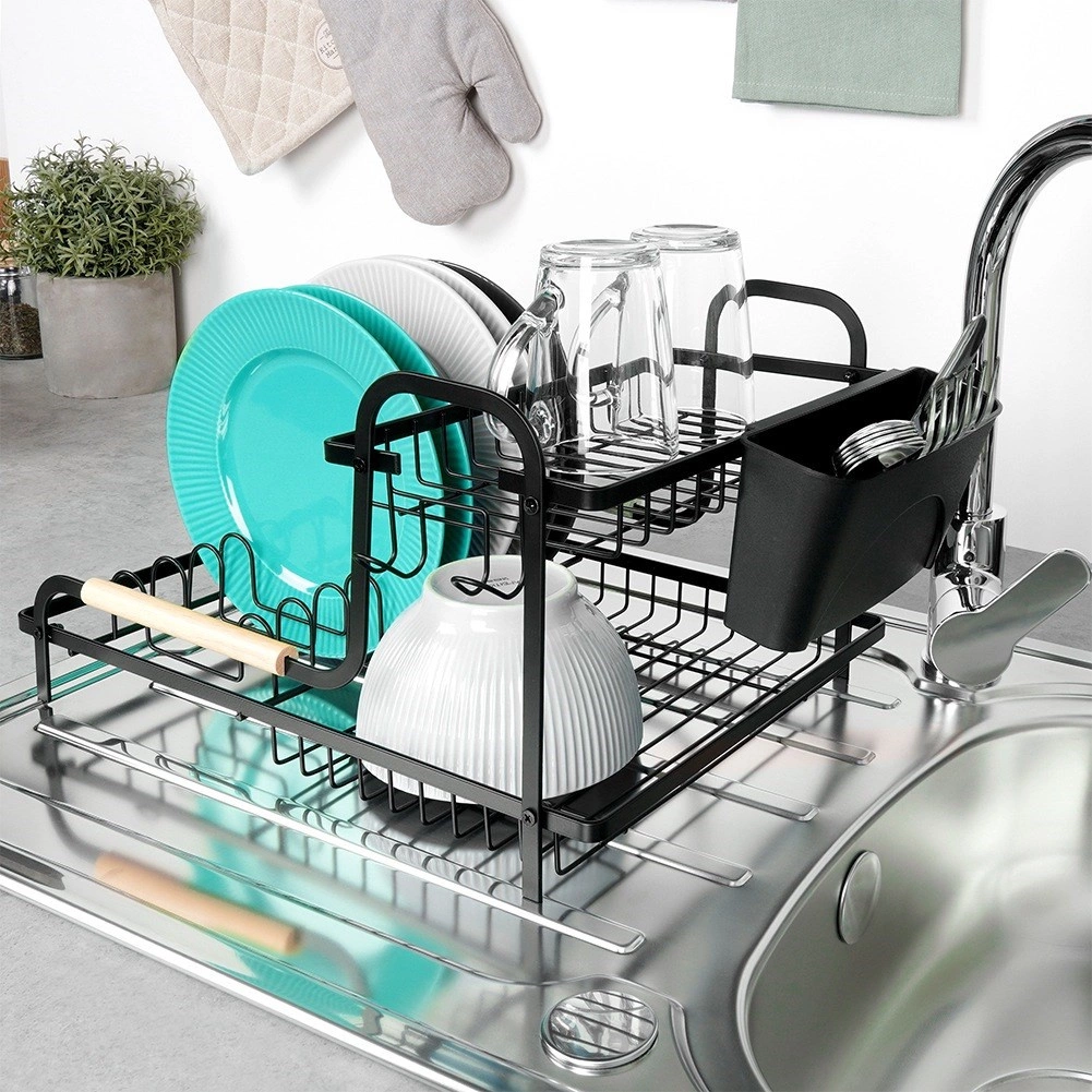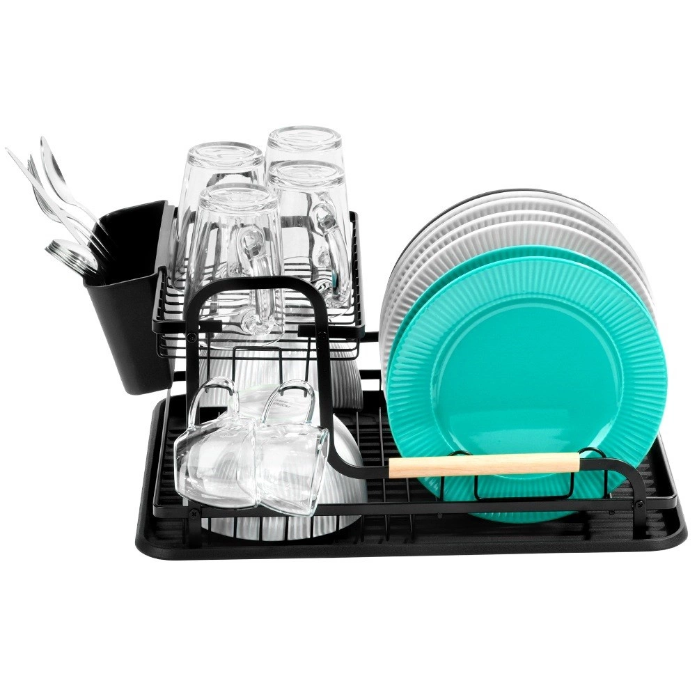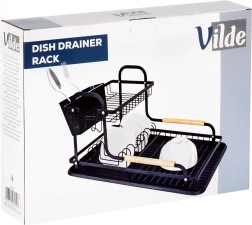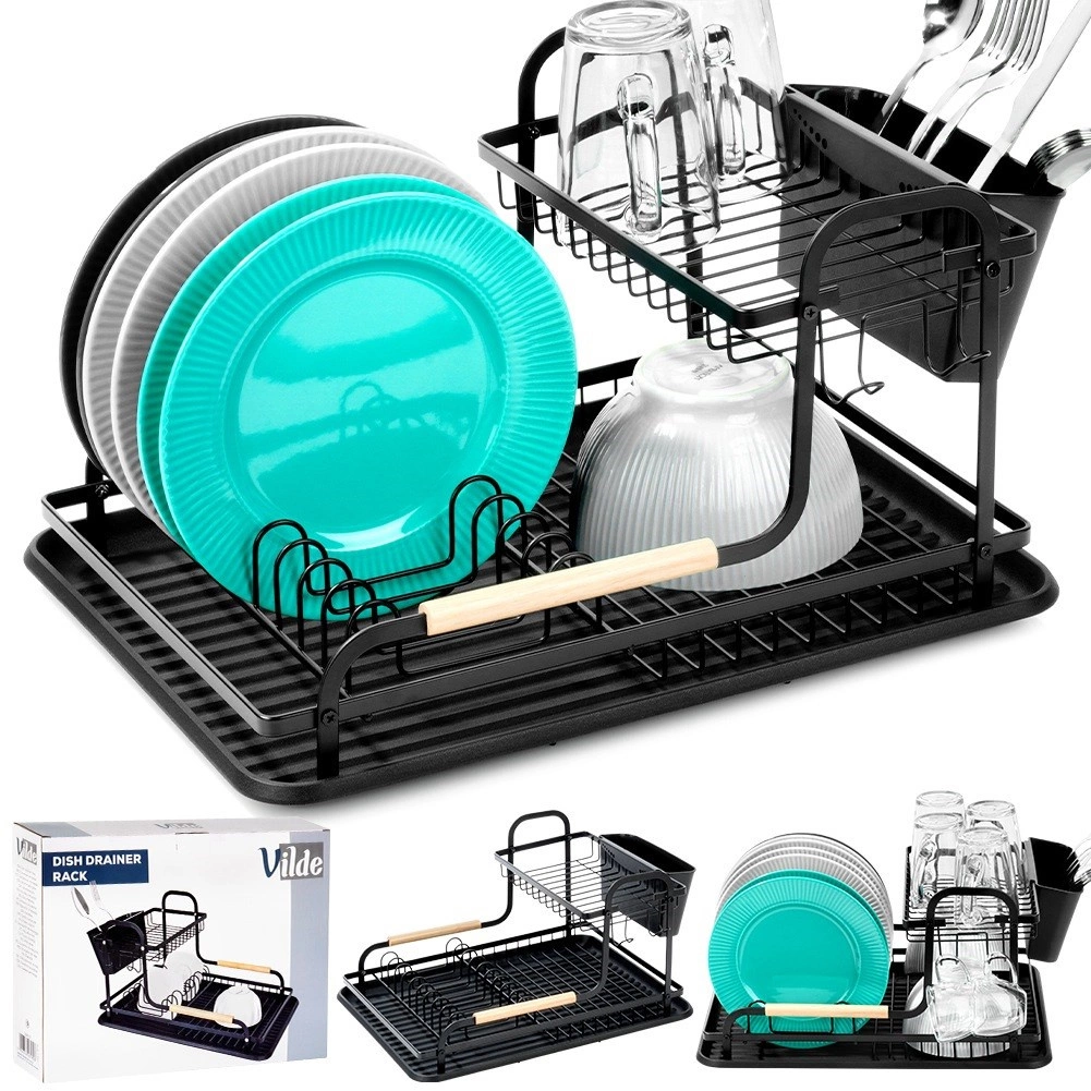 Het robuuste frame van duurzaam metaal met matte zwarte afwerking wordt aangevuld met elegante houten handgrepen voor makkelijk verplaatsen. De uitneembare bestekhouder met twee compartimenten helpt alles op orde te houden en versnelt het drogen. Het afdruiprek is gemakkelijk schoon te maken en ontworpen voor dagelijks gebruiksgemak.