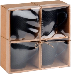 Stijlvolle set van vier zwarte keramische mokken met reliëftextuur, ideaal voor dagelijks koffie-, thee- of cacaogebruik. Elke mok heeft een inhoud tot 400 ml (aanbevolen 270 ml voor comfortabel gebruik), een ergonomisch oor en een modern mat oppervlak. De mokken zijn vaatwasserbestendig en worden geleverd in een cadeauverpakking – perfect als cadeau én voor thuisgebruik.