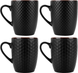 Ontdek een praktische en elegante set van 4 mokken van hoogwaardige keramiek in het zwart met een reliëf geometrisch patroon. Dankzij het comfortabele oor, het aangename oppervlak en de stabiele vorm drink je er heerlijk warme koffie, thee of cacao uit. Het matte design met contrasterende rand oogt modern en past moeiteloos in elke keuken.