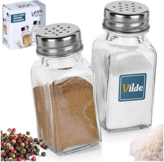 Praktische set van twee strooiers – zout- en peperstrooier van helder dikwandig glas met een metalen deksel met doseeropeningen. Elke container heeft een inhoud van 80 ml en afmetingen van 4 × 4 × 9,5 cm. Ideaal voor dagelijks gebruik thuis en in de horeca, met een klassiek design dat bij iedere tafel past.