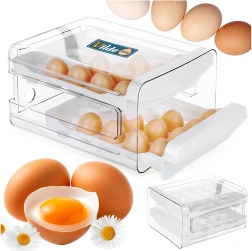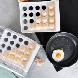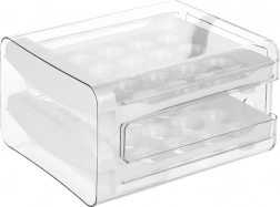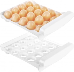 Houd orde in de koelkast met een tweelaagse eierdispenser met een capaciteit van 40 stuks (20 per laag). De transparante kap en witte inzetstukken met speciale houders zorgen voor stabiele plaatsing zonder wegrollen. Dankzij de slimme oplossing zijn eieren beter beschermd tegen beschadiging en blijven ze langer vers.