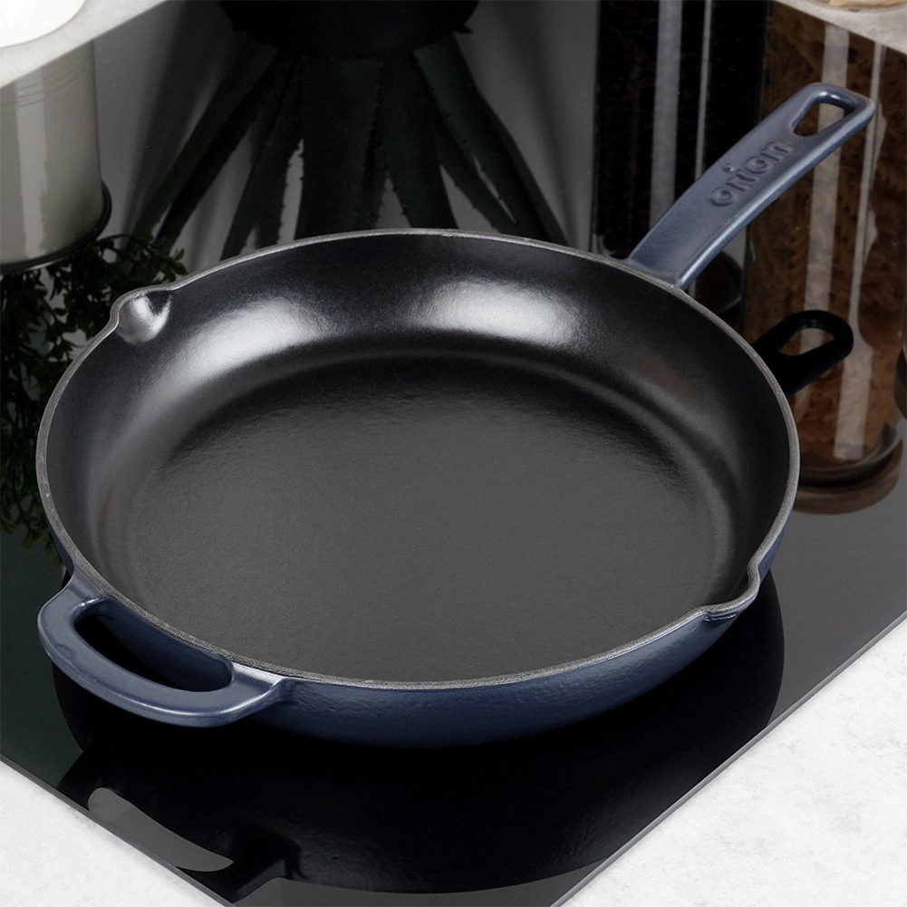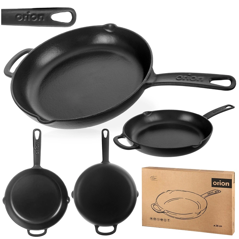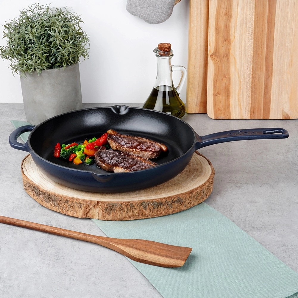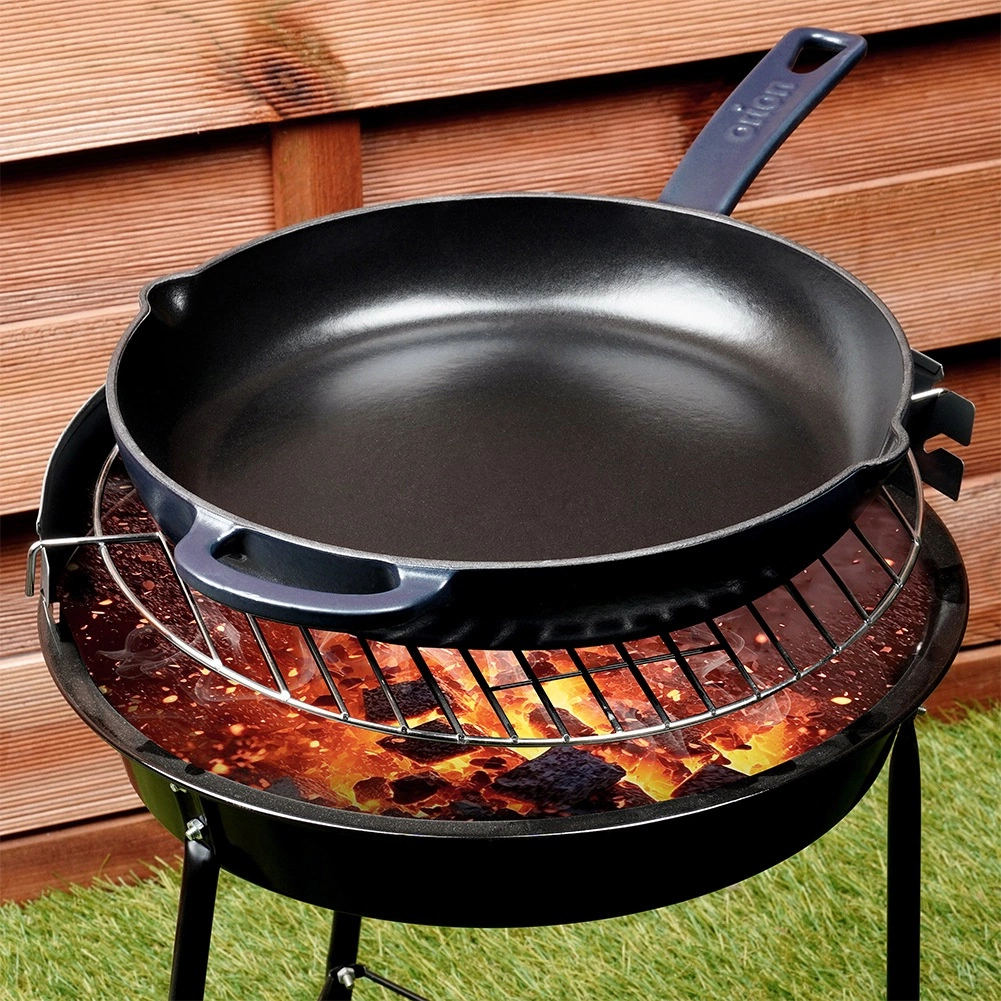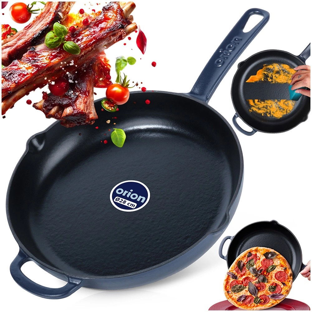 Deze universele gietijzeren pan is ideaal om te bakken, roerbakken, stoven en braden. De duurzame constructie en het geëmailleerde oppervlak maken zowel het koken als het schoonmaken gemakkelijker. De pan houdt hoge temperaturen langdurig vast, perfect voor steak, groenten, aardappelen en pizza. Geschikt voor de keuken, barbecue en open vuur.