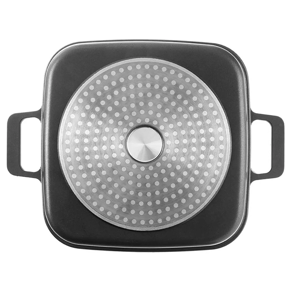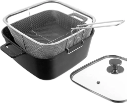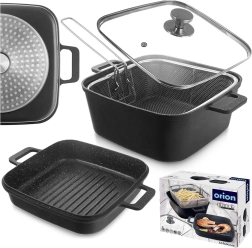 Deze praktische set combineert een vierkante diepe pan met deksel (4,5 l), een grillkoekenpan (2 l) en een roestvrijstalen mand. Dankzij de krassenbestendige anti-aanbak granieten PFLUON-coating bereid je gerechten met minimaal vet en met perfect resultaat. Het transparante glazen deksel met stoomventiel maakt controle eenvoudiger en versnelt het koken.