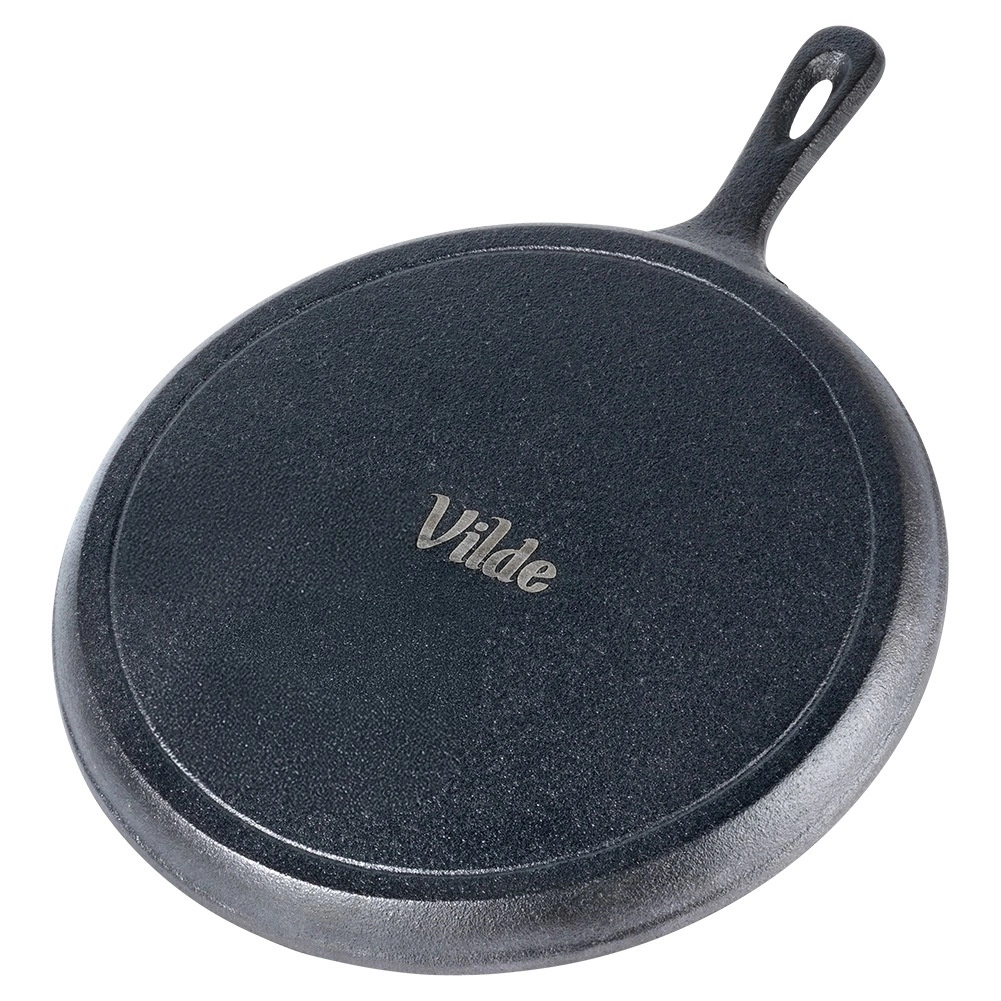 Massief gietijzer slaat warmte uitstekend op en verspreidt die gelijkmatig over het hele oppervlak. Het resultaat: mooi egaal gebakken pannenkoeken, tortilla’s en platbroden zonder koude zones.